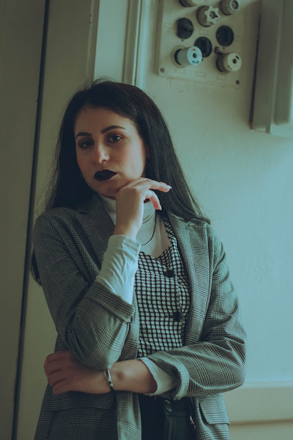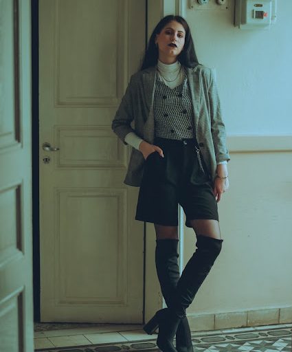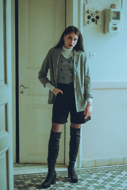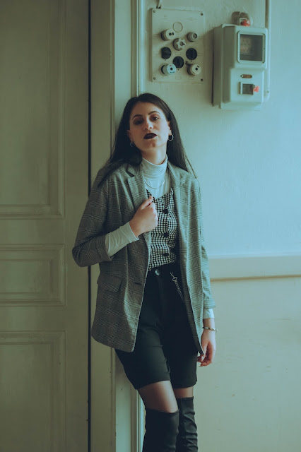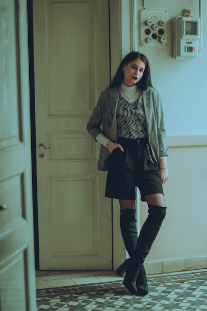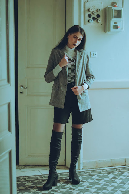 Το σακάκι από πάνω, με το διαφορετικό καρό print αλλά με τις ίδιες αποχρώσεις, ολοκληρώνει και το look αλλά και το mix and match που θέλαμε να πετύχουμε, αφού είναι διαφορετικά αλλά και ίδια παράλληλα. Ασημένια αξεσουάρ όπως η αλυσίδα στον λαιμό, την βερμούδα αλλά και στο χέρι δίνουν την απαραίτητη λάμψη στο look, ενώ οι over knee ψηλοτάκουνες μπότες δίνουν μια δόση κομψότητας και στυλ παραπάνω. Bold χείλη, sleek μαλλιά και είσαι έτοιμη!