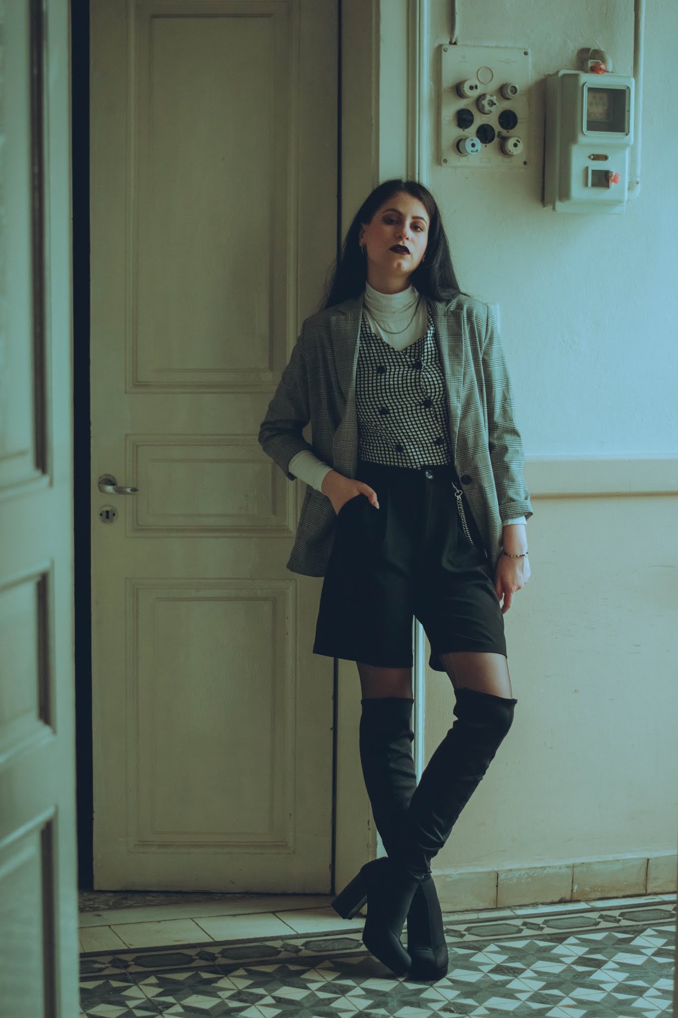 Το σακάκι από πάνω, με το διαφορετικό καρό print αλλά με τις ίδιες αποχρώσεις, ολοκληρώνει και το look αλλά και το mix and match που θέλαμε να πετύχουμε, αφού είναι διαφορετικά αλλά και ίδια παράλληλα. Ασημένια αξεσουάρ όπως η αλυσίδα στον λαιμό, την βερμούδα αλλά και στο χέρι δίνουν την απαραίτητη λάμψη στο look, ενώ οι over knee ψηλοτάκουνες μπότες δίνουν μια δόση κομψότητας και στυλ παραπάνω. Bold χείλη, sleek μαλλιά και είσαι έτοιμη!