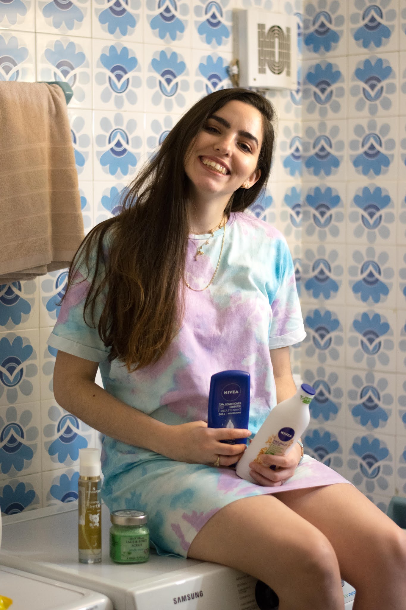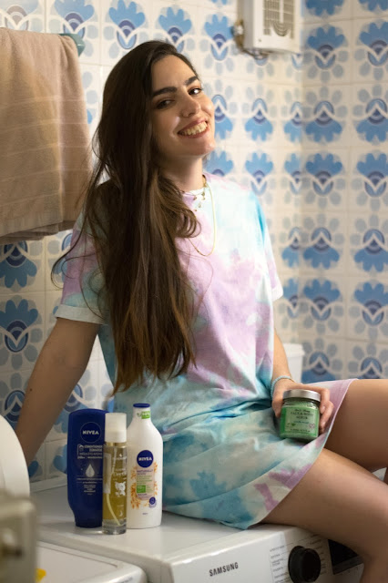 Το αγαπημένο της scrub σώματος και προσώπου από το Mystery Soap Box, το ενυδατικό conditioner σώματος και η lotion της αγαπημένης Nivea, αλλά και το ξηρό λάδι με μαστίχα της σειράς Cleria από την Pharmasept είναι μερικά από τα αγαπημένα της.