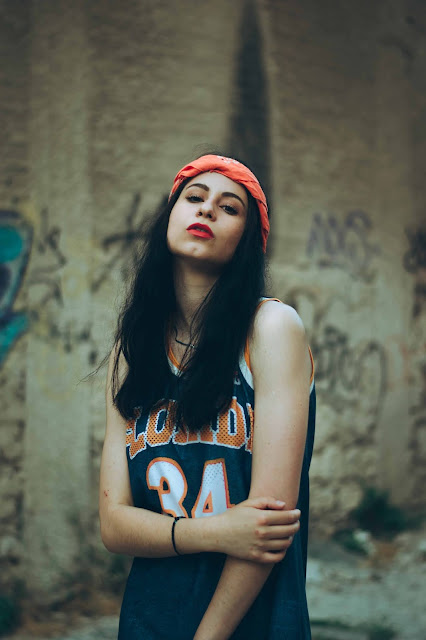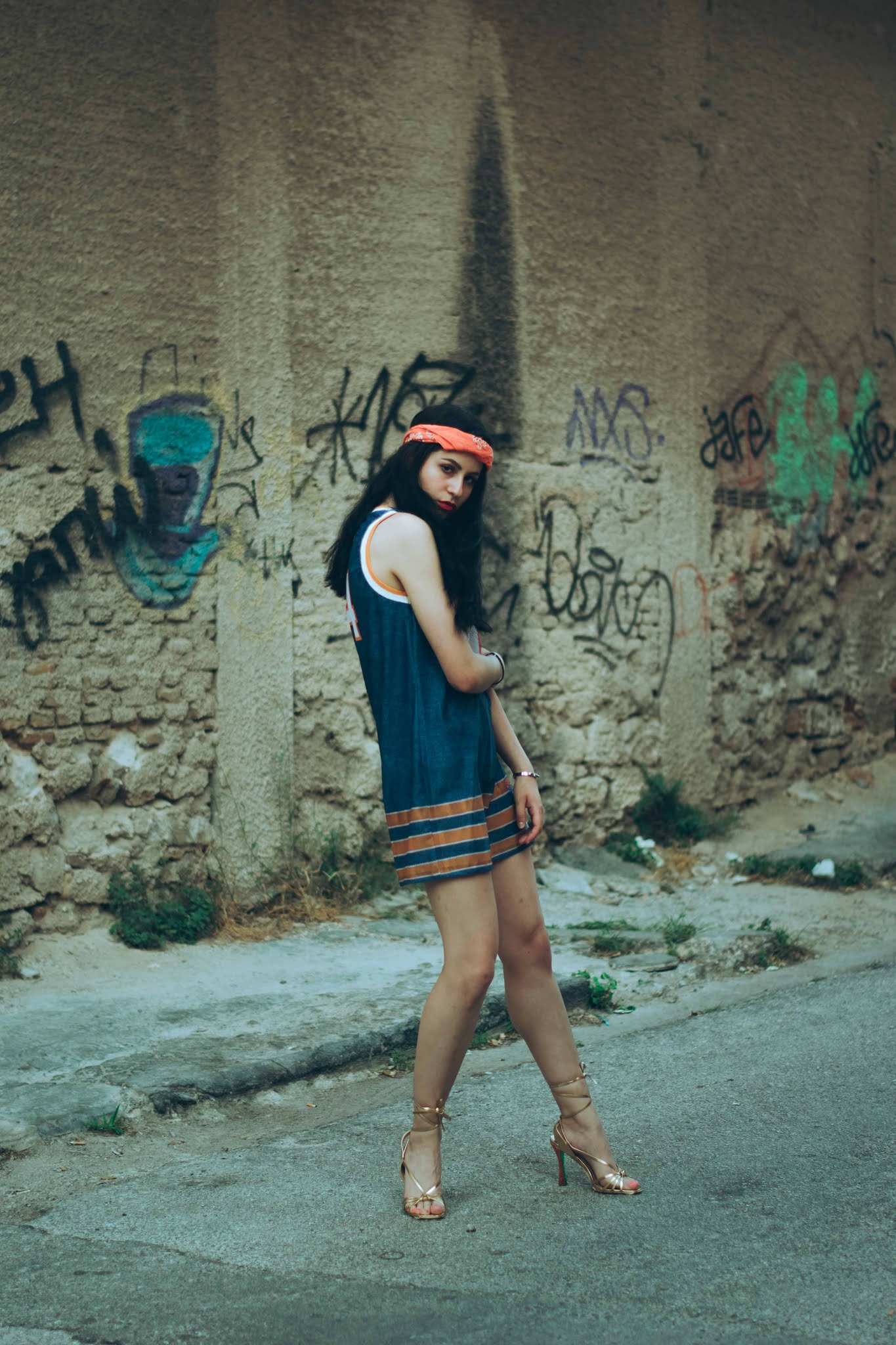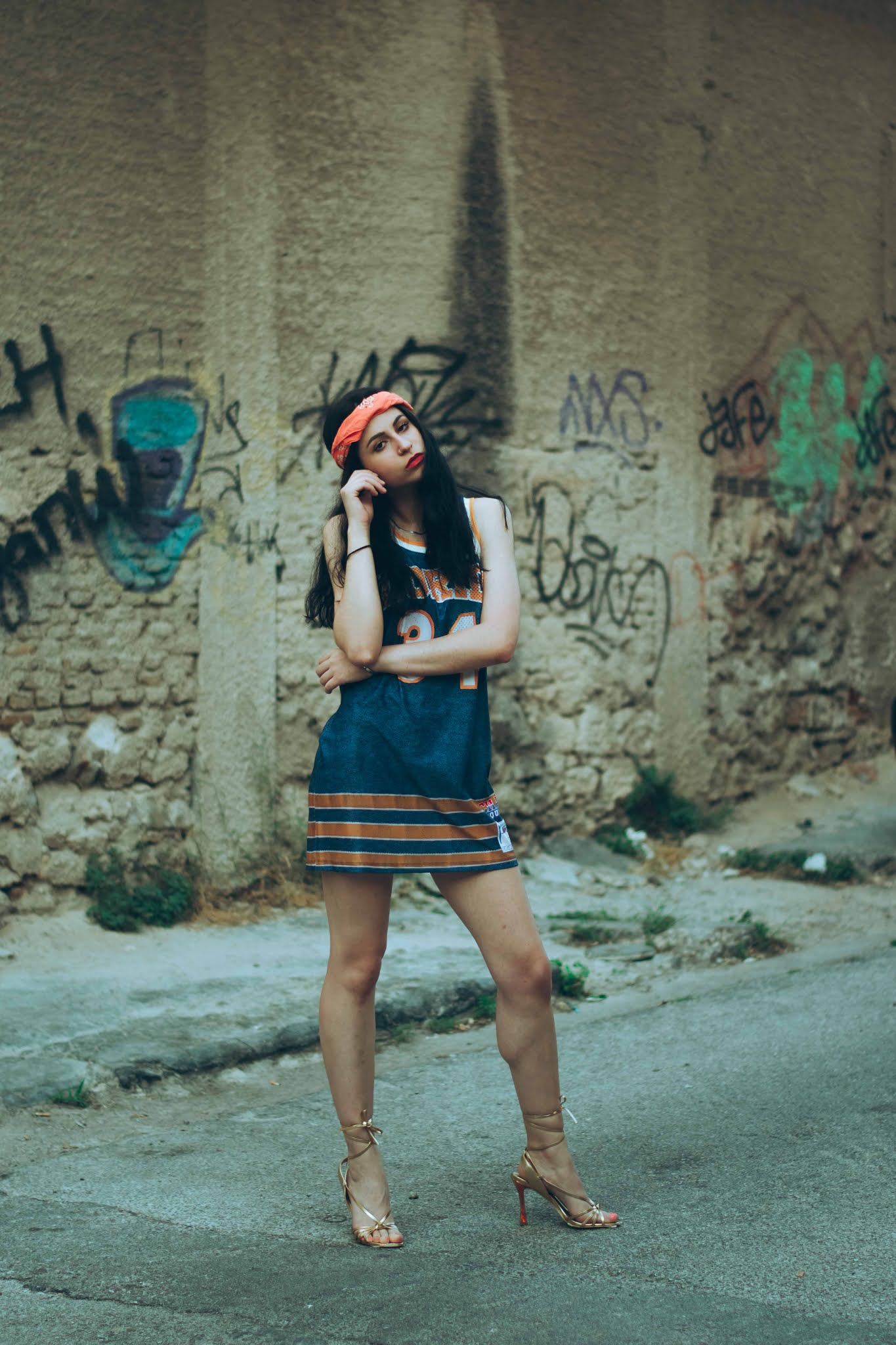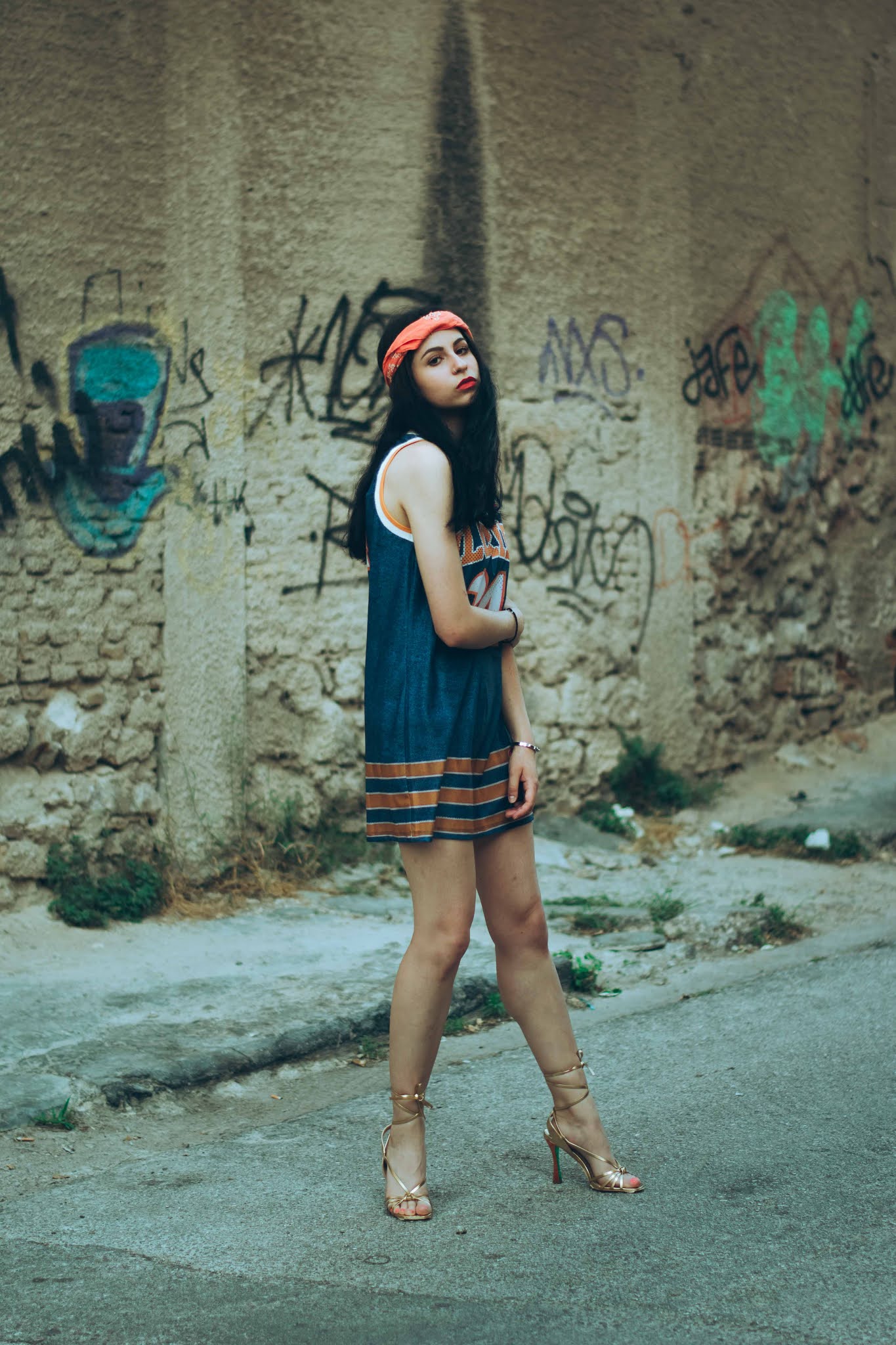 Έχοντας εντάξει πλέον το athleisure σαν στυλ σε κάθε ώρα της ημέρας, τολμήσαμε το φόρεμα που μοιάζει με oversized basket shirt, σε super αποχρώσεις του μπλε και του πορτοκαλί, ενώ το συνδυάσαμε με λαμπερά πέδιλα που δένουν στον αστράγαλο. Για να απογειώσουμε το attitude, δέσαμε μια bandana σε φωτεινό πορτοκαλί στα μαλλιά, που κάνει αντίθεση και με το χρώμα τους αλλά και με το φόρεμα, ενώ στους ίδιους τόνους κινήθηκε και το μακιγιάζ. Είναι ιδανικό για τις βραδινές βόλτες σου που θέλεις να είσαι άνετη αλλά με στυλ, φορώντας λαμπερά πέδιλα.