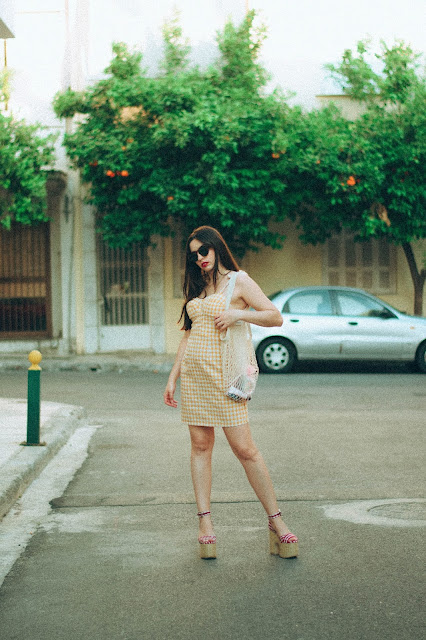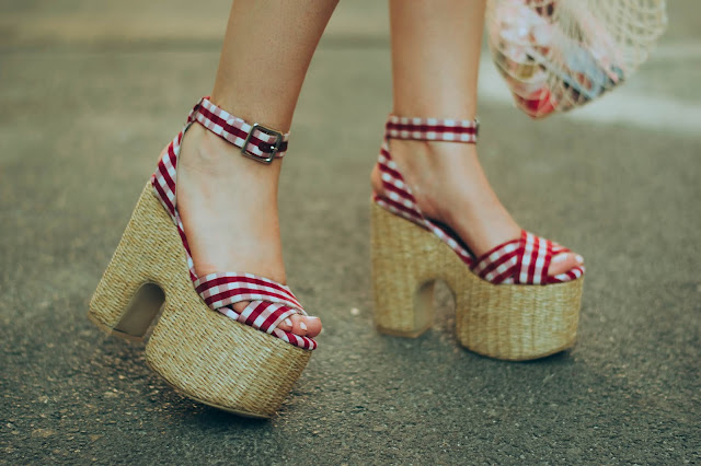 Για να απογειωθεί το look επιλέξαμε πλατφόρμες με ψάθινο πάτο και gingham print επίσης, οι οποίες αν και πολύ ψηλές είναι αρκετά άνετες και με full καλοκαιρινή διάθεση. Διακριτικά χρυσά κοσμήματα που δεν αποχωριζόμαστε στιγμή, τα αγαπημένα μας γυαλιά ηλίου και το κόκκινο κραγιόν είναι οι πινελιές που συμπληρώνουν αυτό το outfit, ενώ η δικτυωτή μπεζ τσάντα είναι αυτή που ξεχωρίζει.