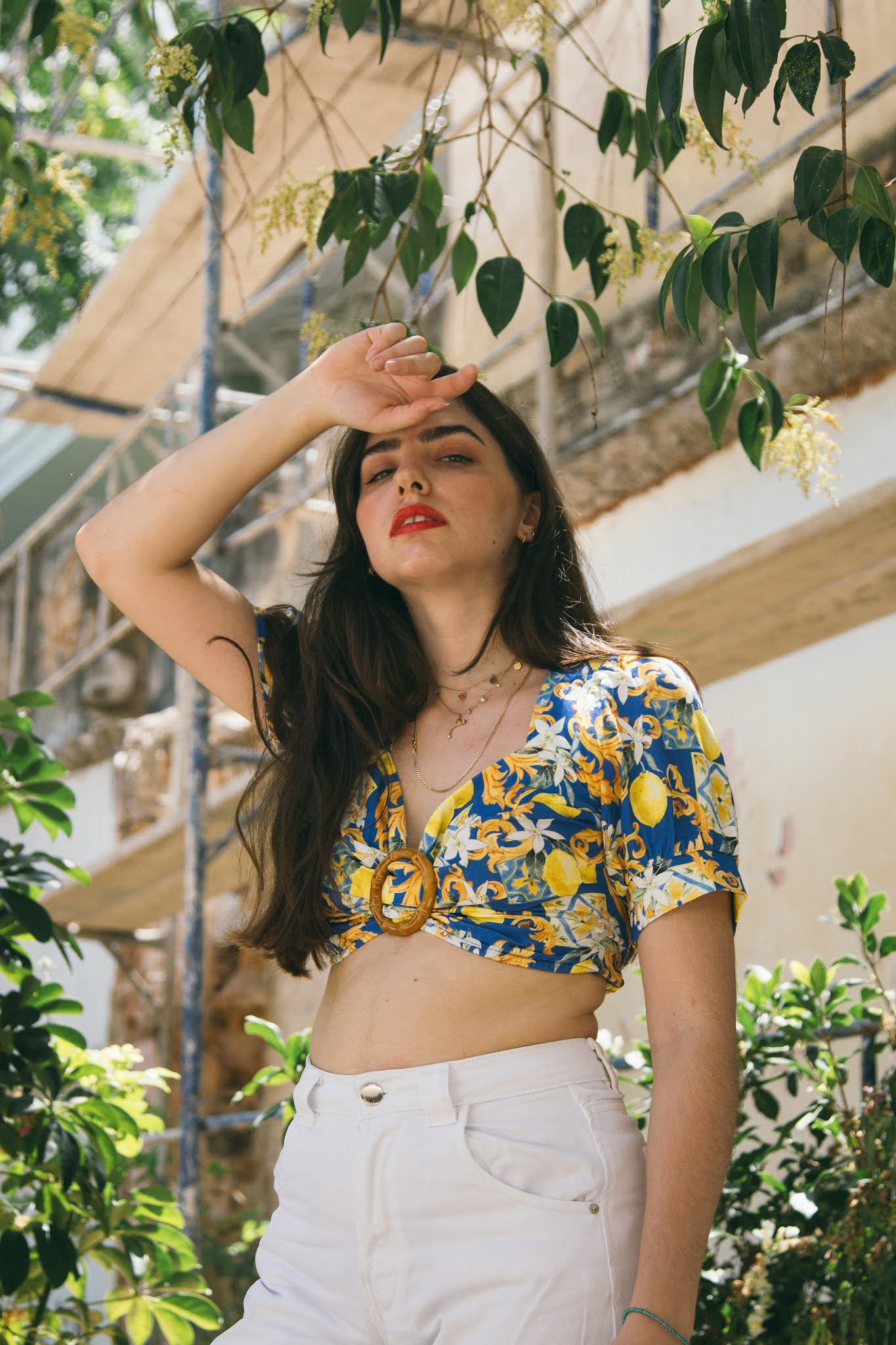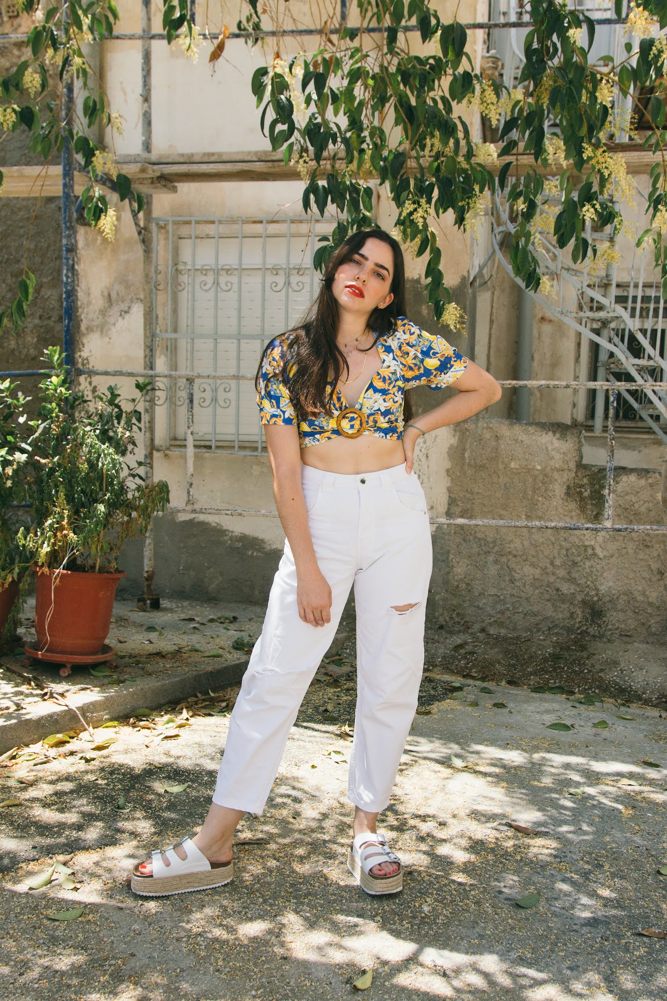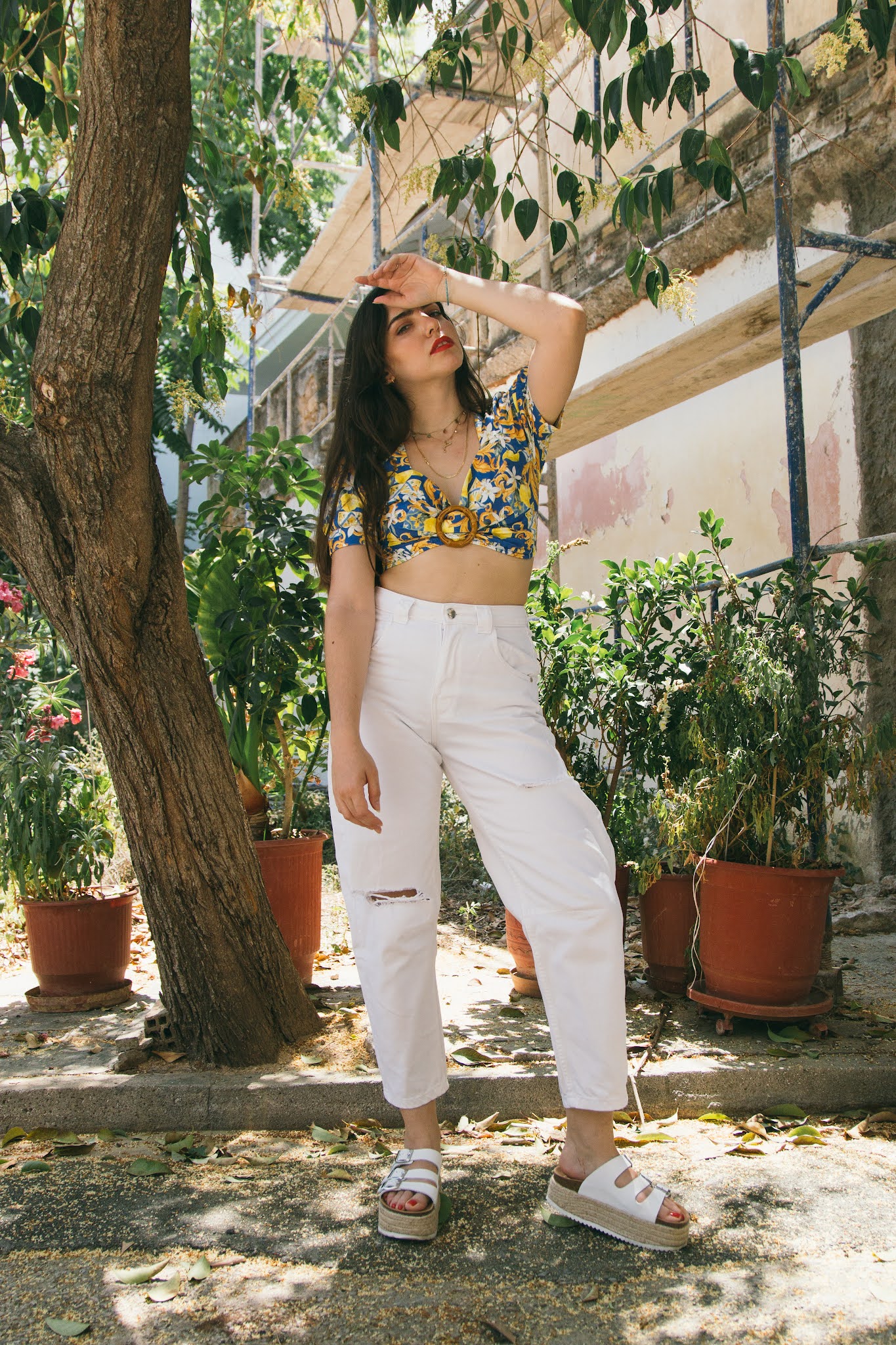 Σχετικά με το outfit, αγαπήσαμε το λευκό σε κάθε του εκδοχή, για αυτό και το επιλέξαμε και ως βάση σε αυτό το look. Τα λεμόνια δίνουν την ένταση και το ενδιαφέρον σε αυτό, ειδικά αφού το crop top με την αγκράφα στο στήθος δίνει extra στυλ και summer vibes χωρίς ιδιαίτερο κόπο και styling. Το λευκό ψηλόμεσο slouchy παντελόνι, μπορεί να μην κολακεύει τη σιλουέτα αλλά δίνει attitude, ενώ τα flatforms με τις αγκράφες το απογειώνουν χωρίς να αποχωριζόμαστε την άνεση μας στιγμή. Ένα φωτεινό κόκκινο κραγιόν και διακριτικά χρυσά αξεσουάρ είναι η τελευταία πινελιά, σε ένα look που τολμήσαμε αυτό το καλοκαίρι, για βόλτες από το πρωί μέχρι το βράδυ.