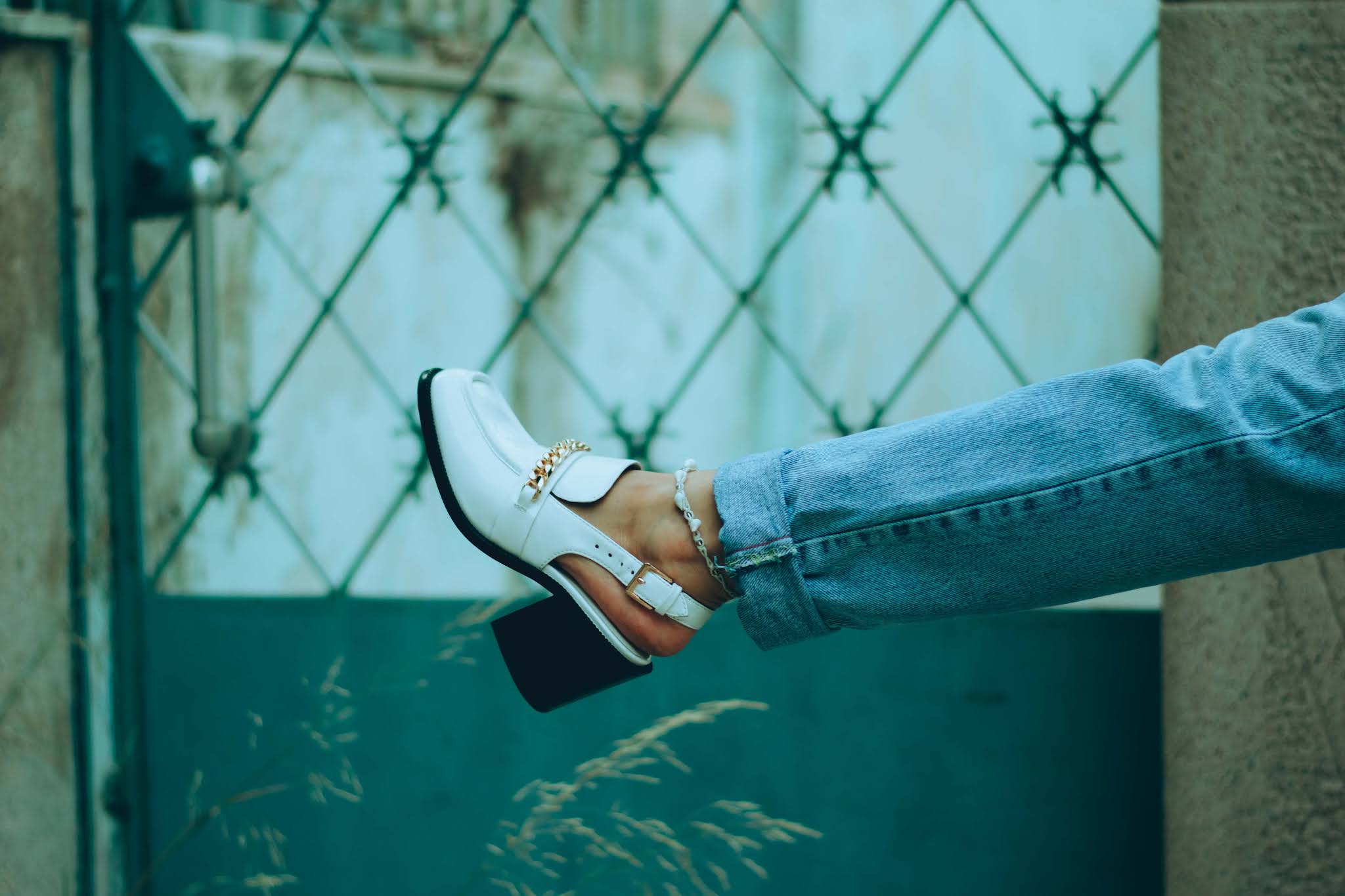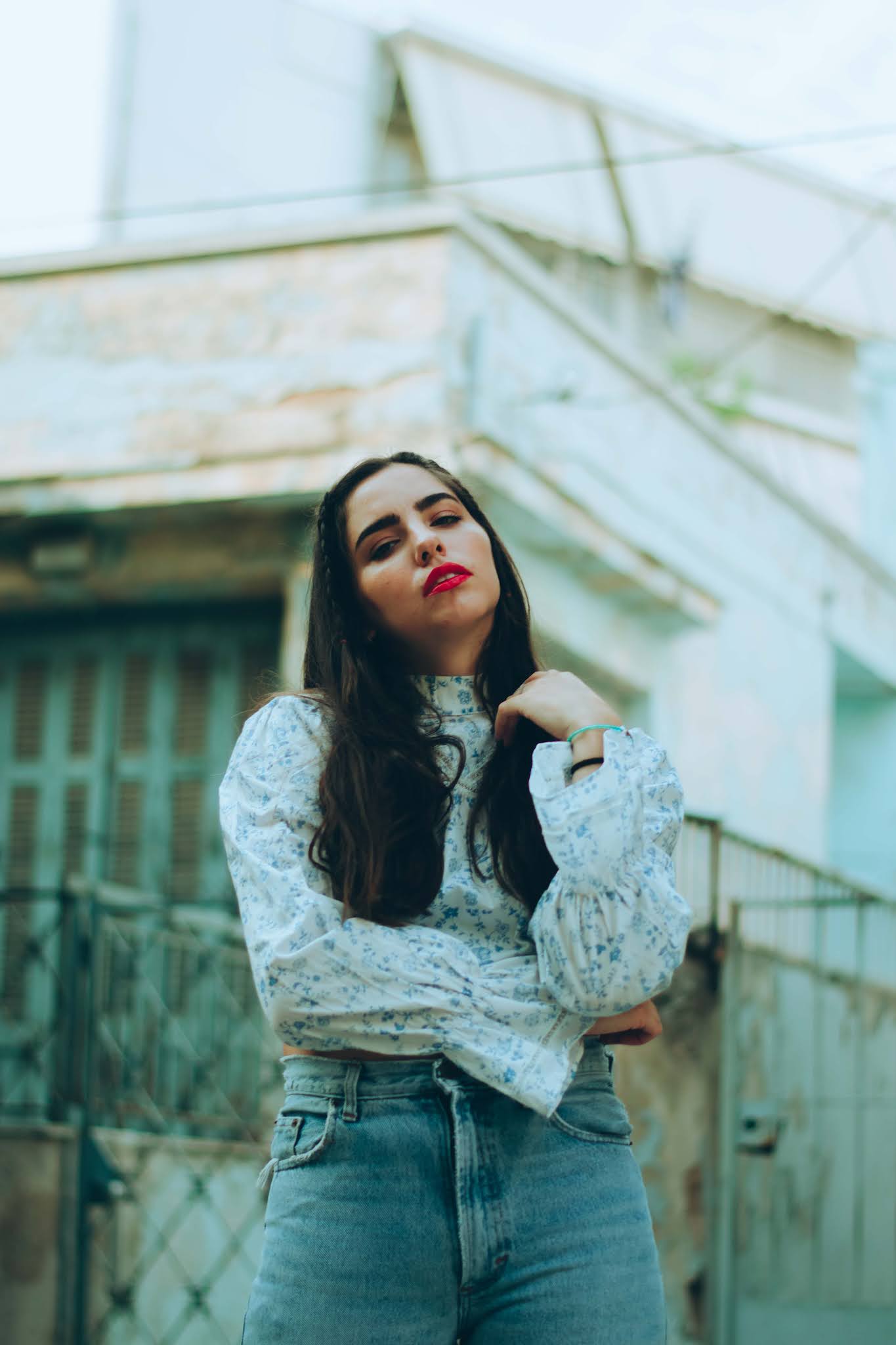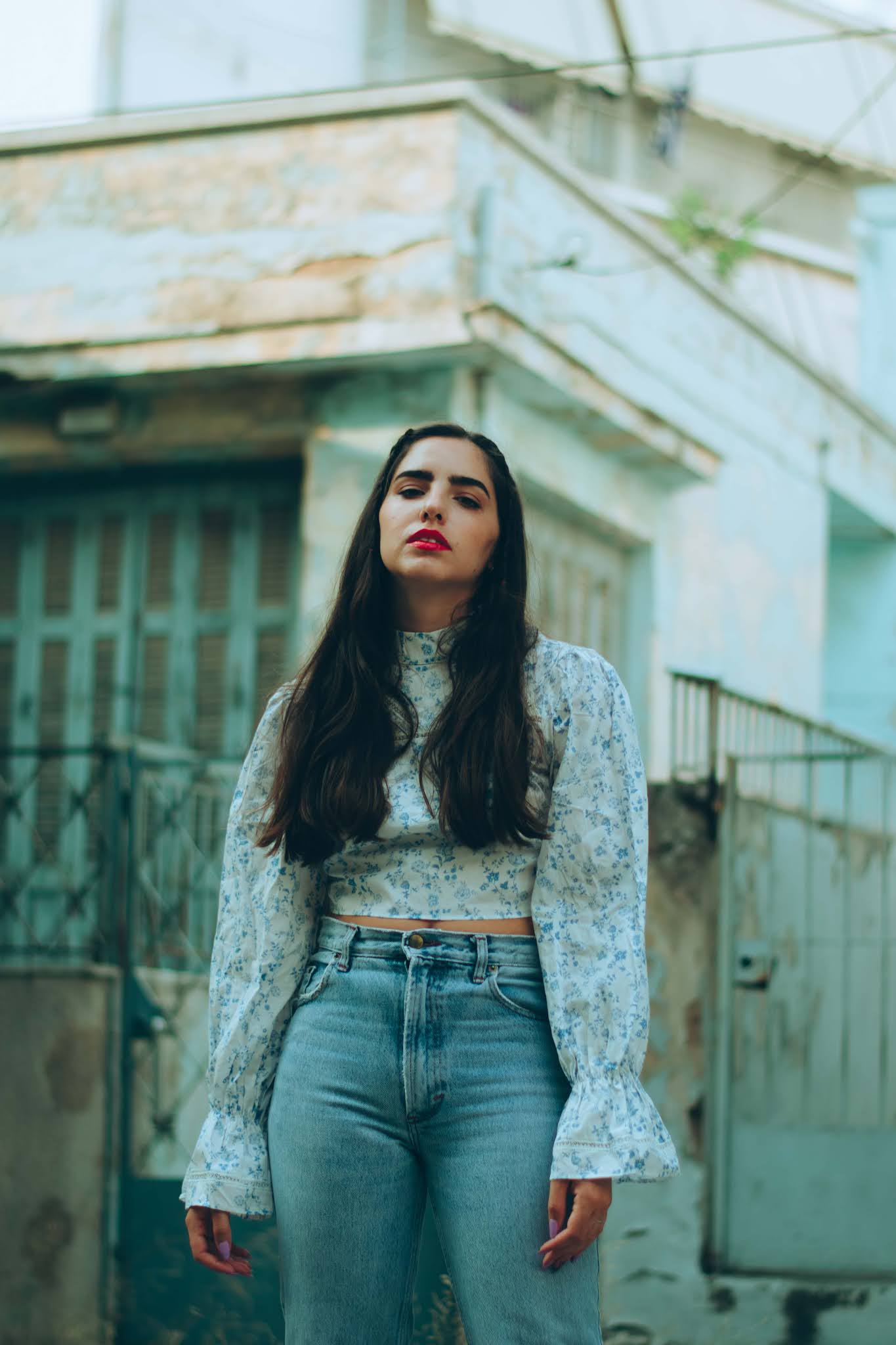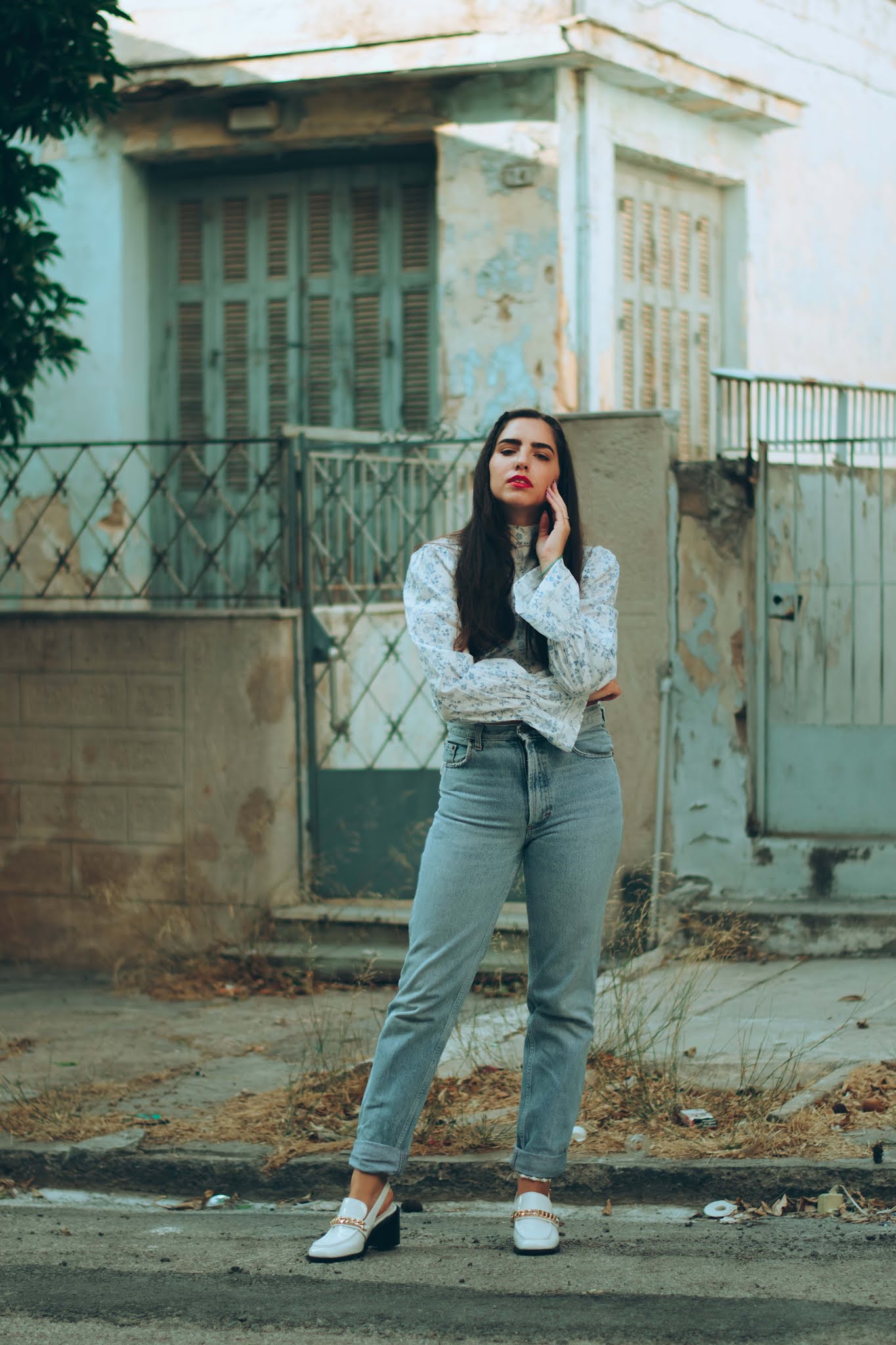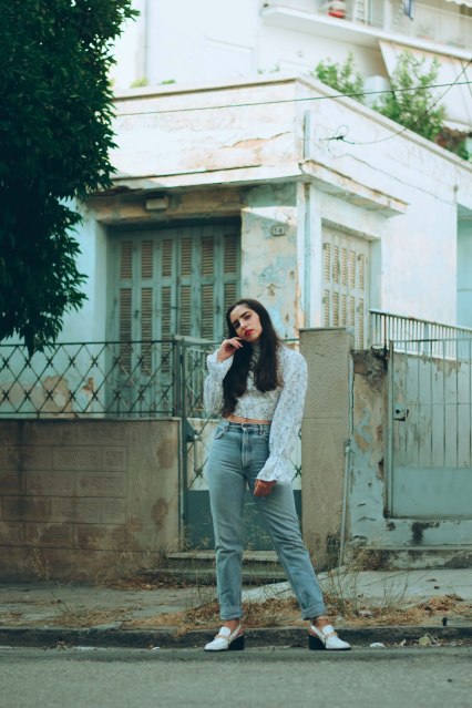Για να συνεχίσουμε στην ίδια χρωματική παλέττα, προσθέσαμε ένα crop top με γιακά και φουσκωτά μανίκια, του οποίου το print είναι αυτό το vintage floral που σου θυμίζει τα ρούχα της μαμάς σου τη δεκαετία του ’70, όπου το hippie ήταν top trend. Δίνει λάμψη στο πρόσωπο και αναδεικνύει το έντονο κραγιόν που επιλέξαμε, ενώ τα λευκά loafers με το λίγο χοντρό τακούνι και την χρυσή μεταλλική αγκράφα, απογειώνουν αυτό το vintage look, με λάμψη και στυλ.
