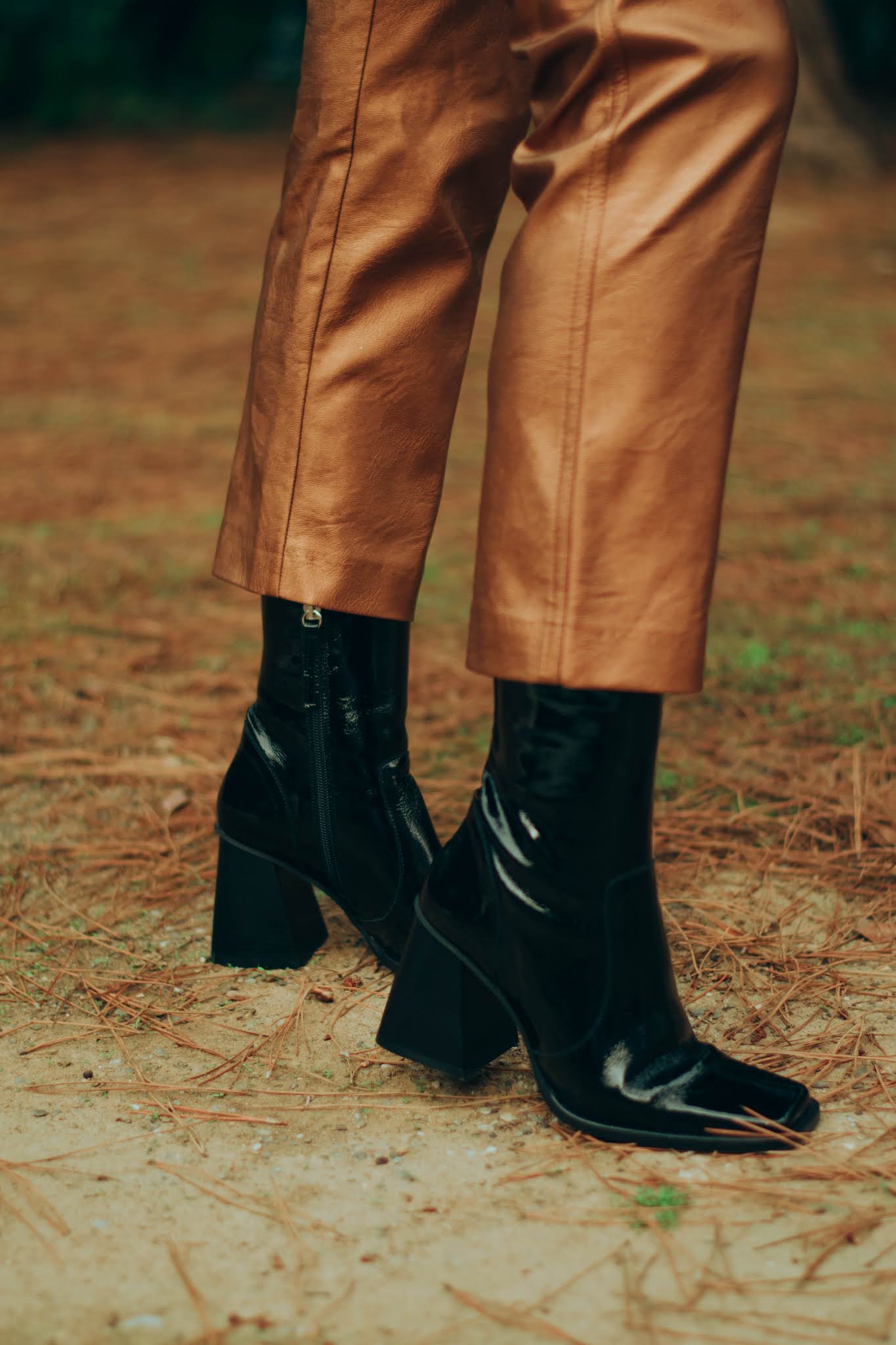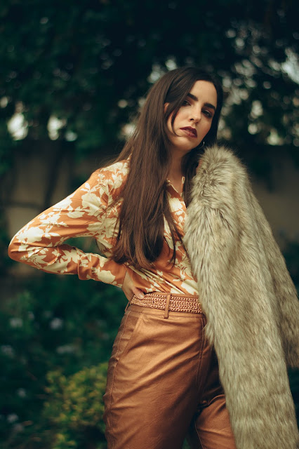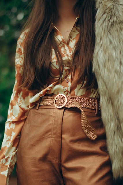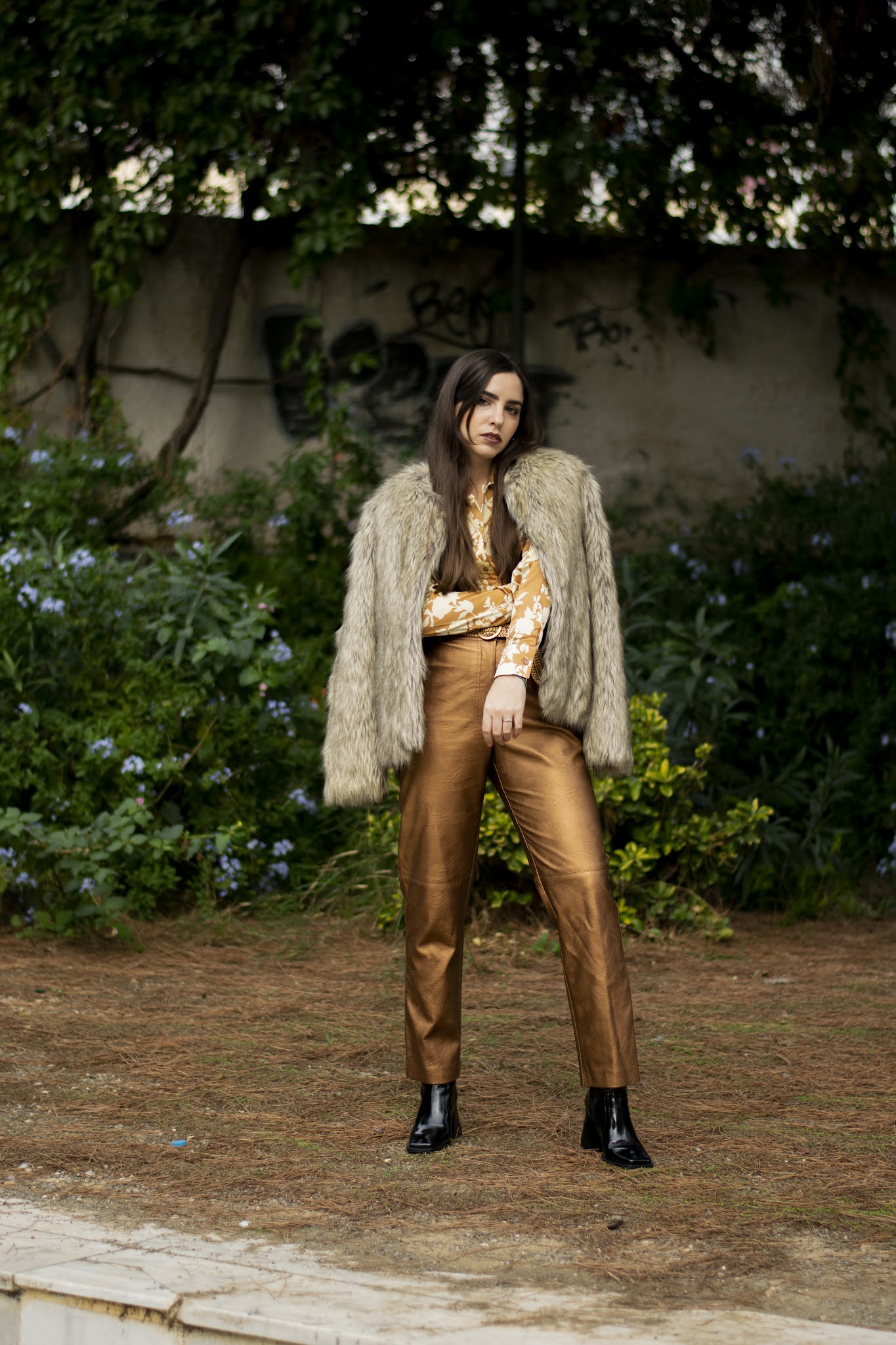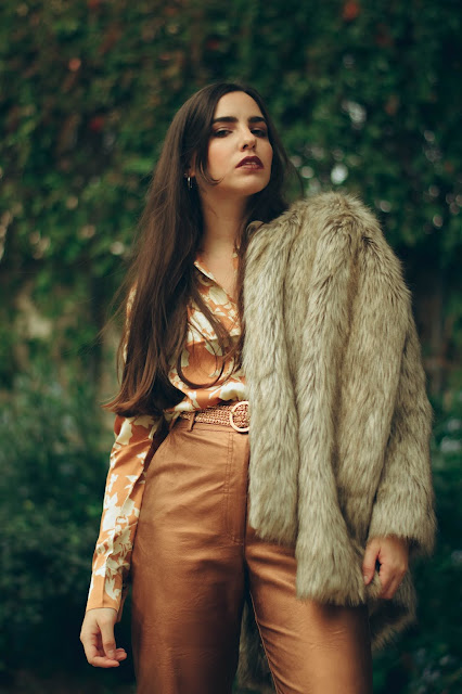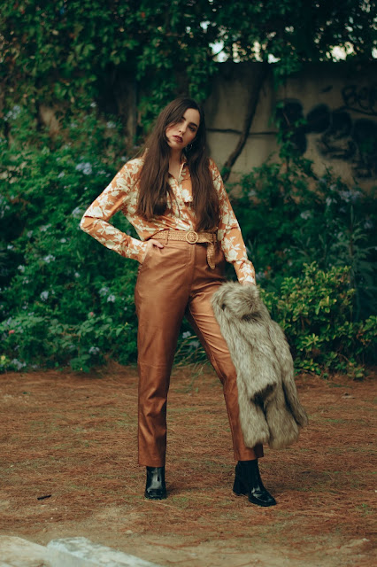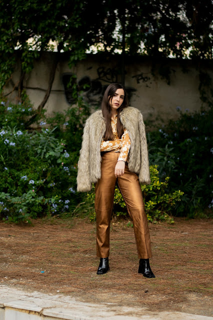 Βασισμένο σε λάμψεις και κομψές γραμμές, αποτελείται από ένα ψηλόμεσο παντελόνι σε ίσια γραμμή με μεταλλική υφή σε bronze αποχρώσεις, το οποίο συνδυάσαμε με ένα σατέν floral πουκάμισο σε παρόμοιους τόνους, το οποίο έδωσε λάμψη και ρομαντικά vibes. Για να απογειώσουμε αυτό το super sparkling look, επιλέξαμε ένα ζευγάρι μποτάκια αστραγάλου με vinyl υφή και τετράγωνη μύτη και τακούνι, που παραπέμπουν στη δεκαετία του ’80 και δίνουν πιο disco attitude. Μη μπορώντας να αποφύγουμε το πανωφόρι λόγω του κρύου καιρού, τολμήσαμε τη γούνα σε αποχρώσεις του γκρι και του καφέ για να μας κρατήσει ζεστές με στυλ, ενώ η πλεκτή ζώνη και τα διακριτικά σκουλαρίκια είναι αυτά που ολοκλήρωσαν αυτό το outfit.