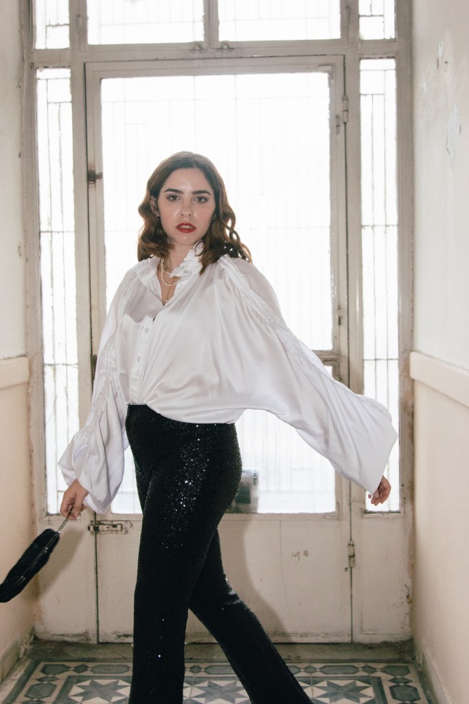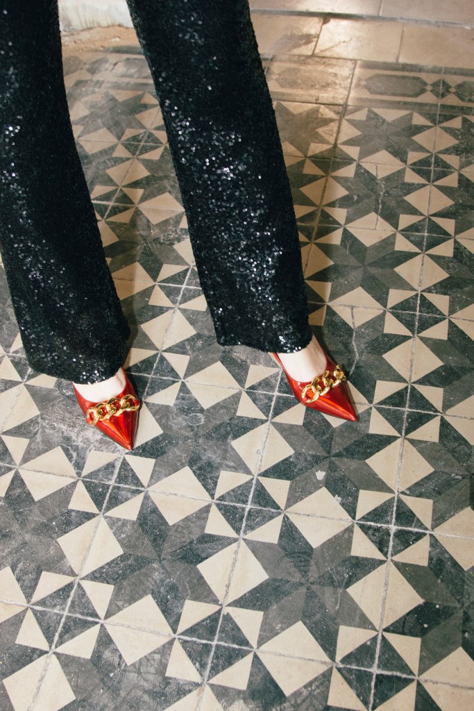 Η Χριστίνα έδωσε έμφαση στη σιλουέτα γενικότερα, φορώντας ένα παντελόνι με παγιέτες σε όλη την επιφάνεια και ένα σατέν πουκάμισο με βικτωριανές λεπτομέρειες, όπως τα μανίκια και ο γιακάς. Για να δώσει χρώμα στο black & white look, φόρεσε κατακόκκινα γυαλιστερά mules με χρυσή αγκράφα που ταίριαξαν ιδανικά με το κόκκινο κραγιόν της αλλά και τα χρυσά διακριτικά της κοσμήματα.