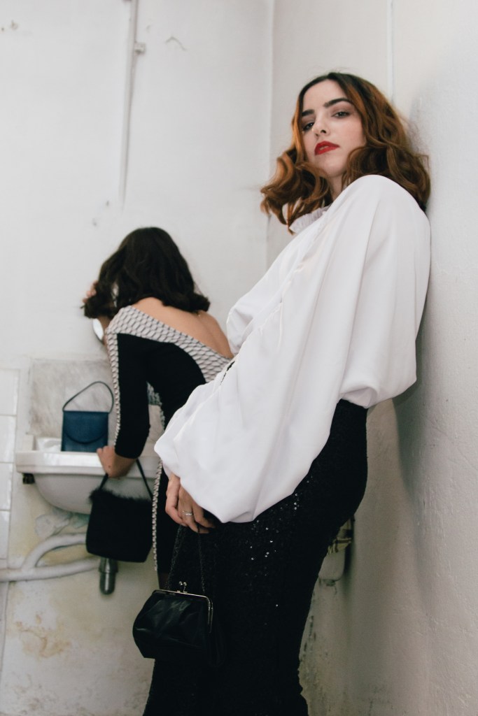 Τέλος, η guest της παρέας μας, η Μαριλένα, τόλμησε και φόρεσε ένα outfit αρκετά διαφορετικό και πιο σύνθετο από ό,τι συνηθίζει, το οποίο αποτελείται από μια vinyl ασύμμετρη φούστα και ένα σατέν πουκάμισο με ελαφρύ ανάγλυφο animal print μοτίβο. Για να δώσει extra ενδιαφέρον και στυλ, δημιουργήσαμε την ψευδαίσθηση του ενιαίου φορώντας ένα ημιδιάφανο μαύρο καλσόν, αλλά και ένα κορμάκι ακριβώς ίδιας σύνθεσης που το κάνει να μοιάζει με ολόσωμη φόρμα και δεν κόβει περισσότερο την σιλουέτα της. Ένα ζευγάρι ankle boots, λεπτομέρειες με πέρλες και ένα μπλε croco τσαντάκι είναι αυτά που ολοκλήρωσαν αυτό το glamorous look.