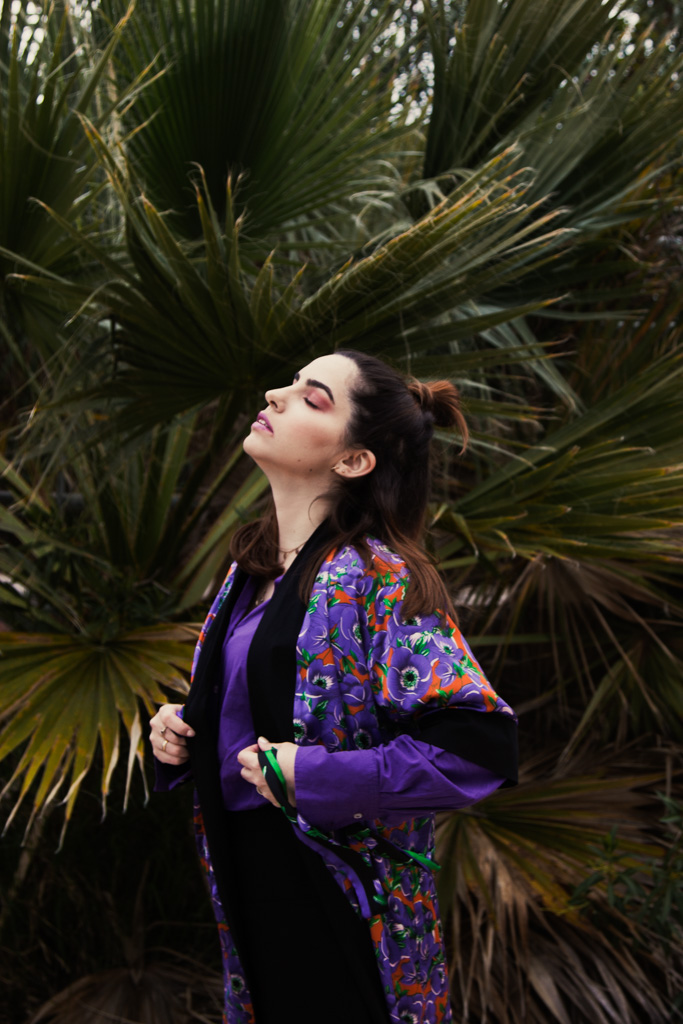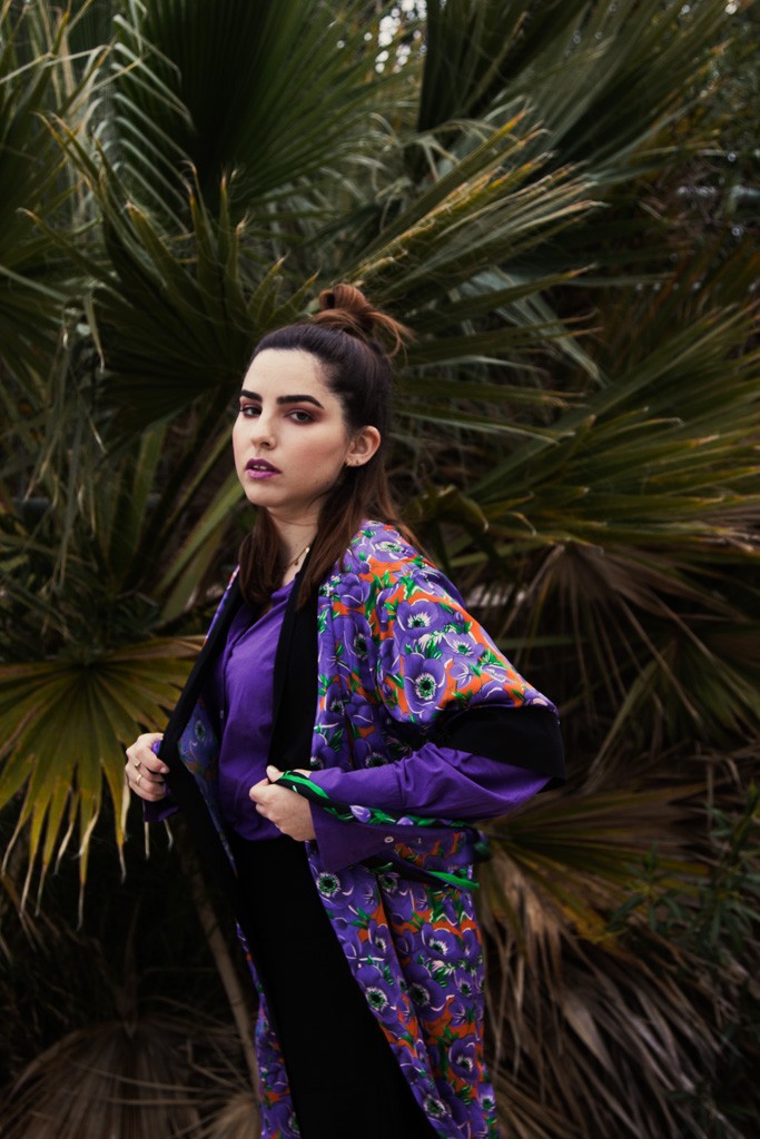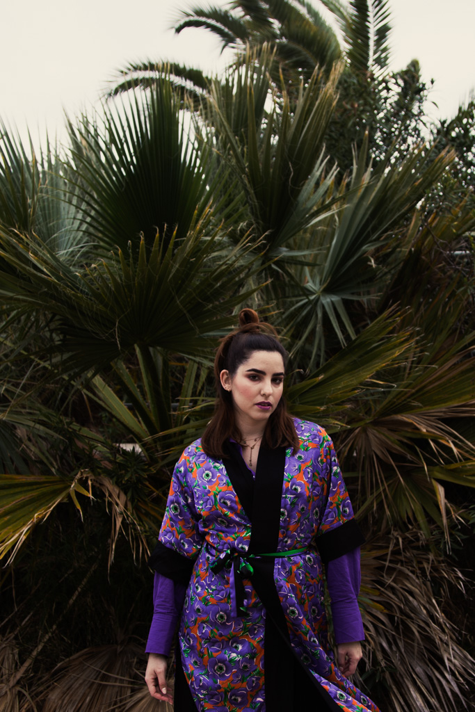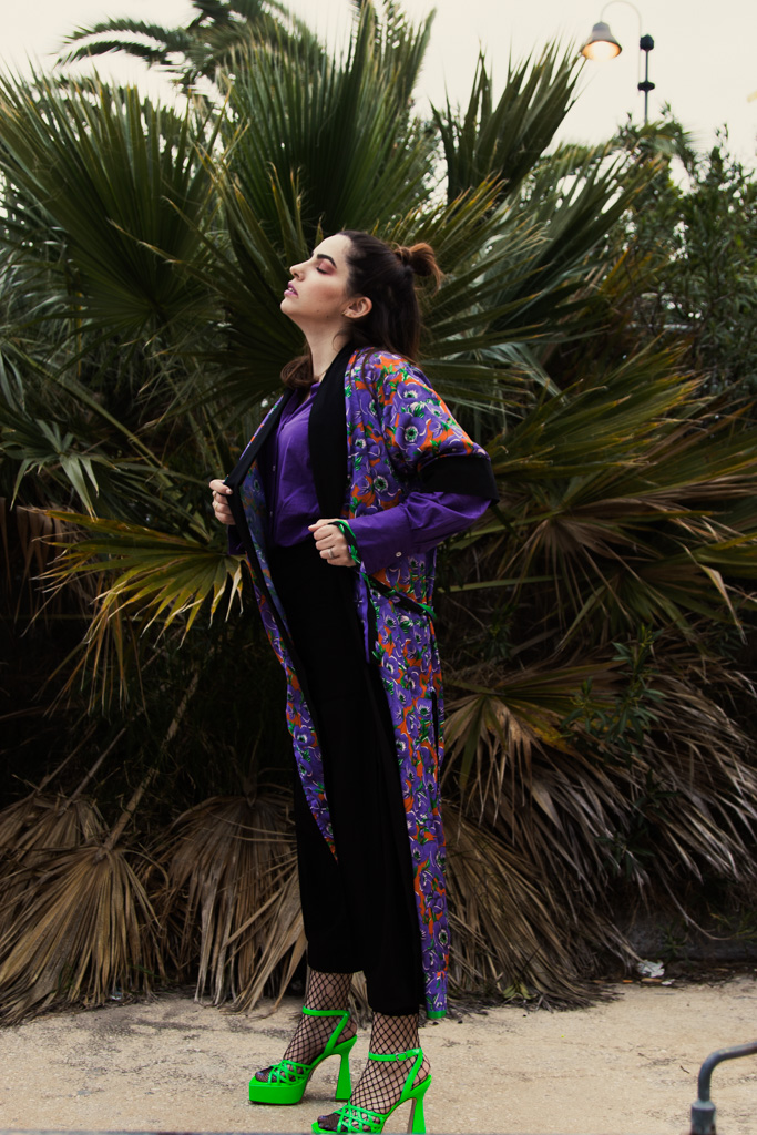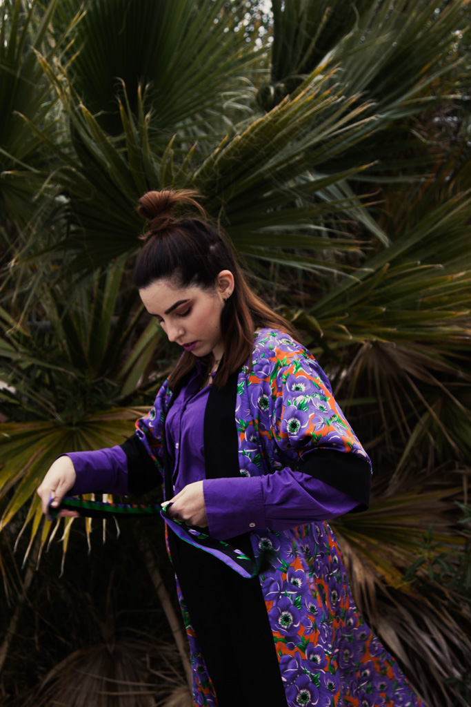 Φορώντας από μέσα ως βάση ένα μαύρο slouchy παντελόνι με στενές μανσέτες στον αστράγαλο, και ένα oversized μωβ πουκάμισο, έχουμε δώσει ένταση και όγκο για ένα σύγχρονο look, ενώ το σατέν κιμονό από πάνω είναι αυτό που ολοκληρώνει τα vibes του outfit και έρχεται σε αντίθεση με τα εσωτερικά ρούχα τα οποία έχουν σύνθεση από ύφασμα που στέκεται διαφορετικά.