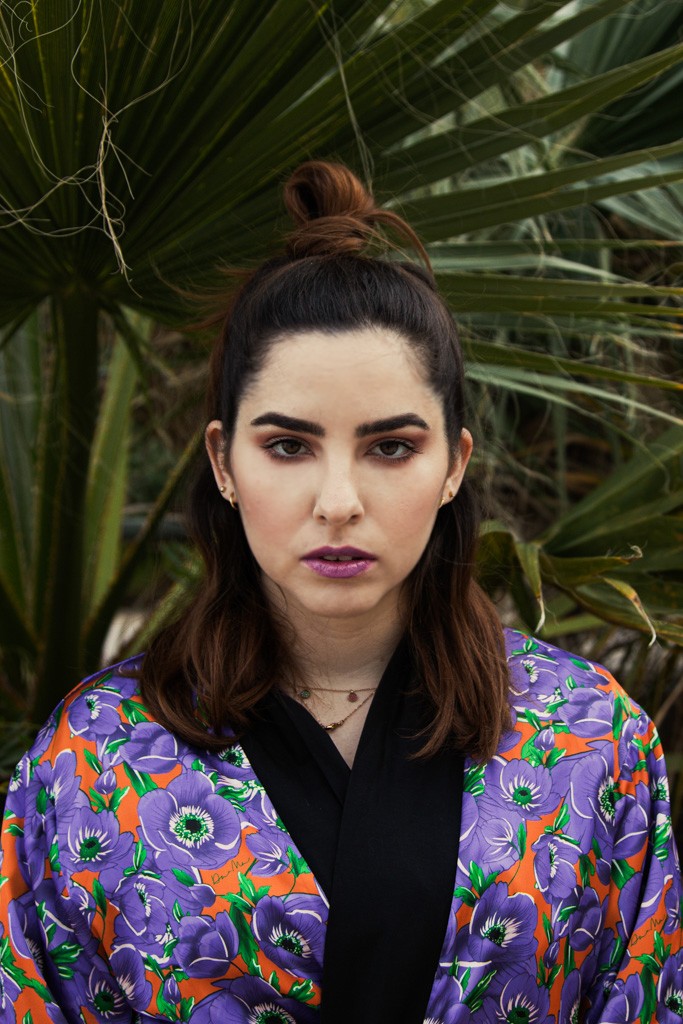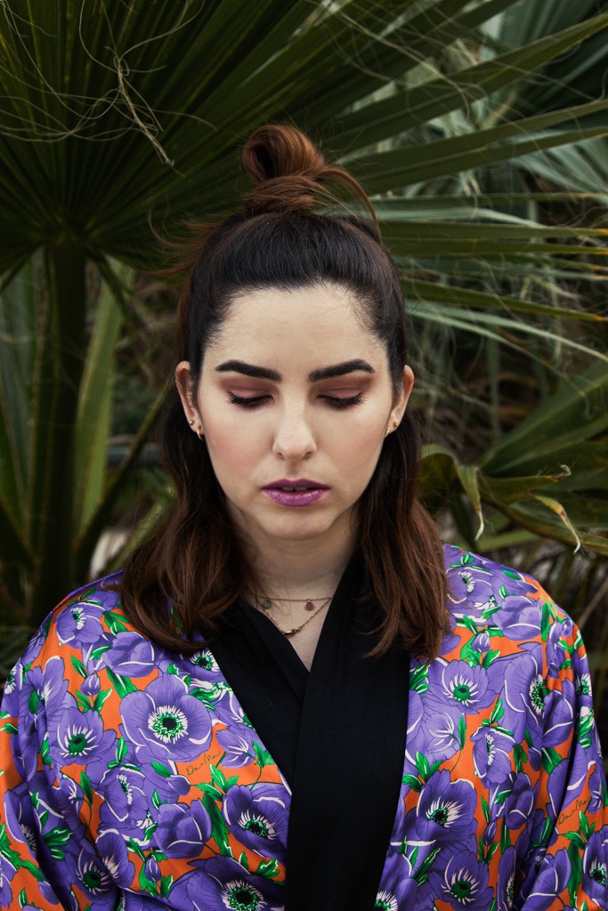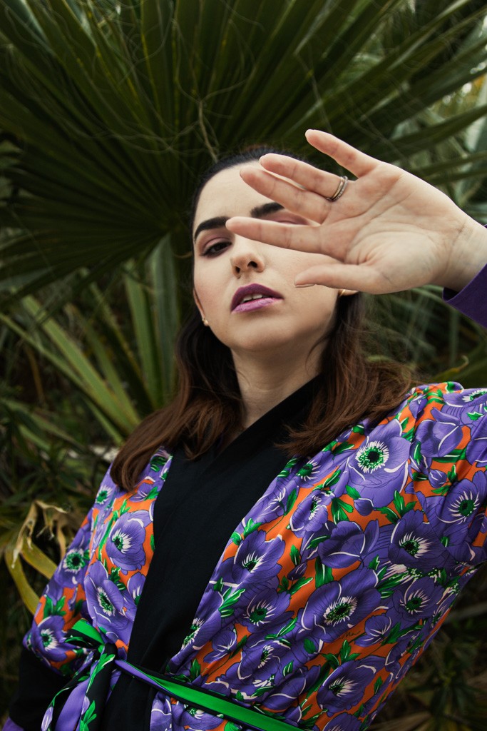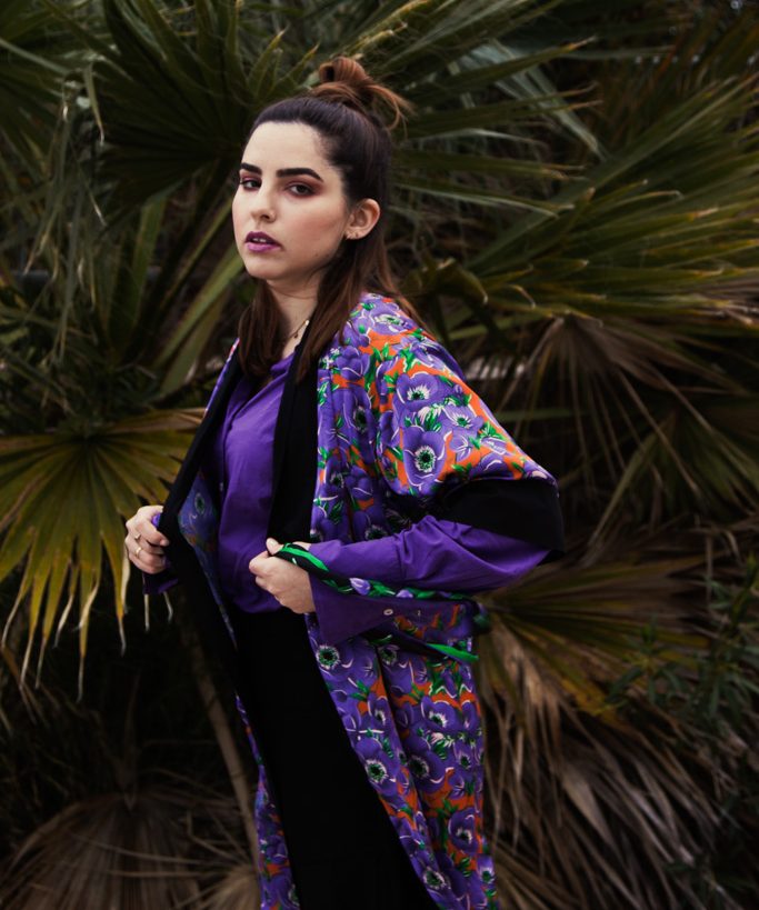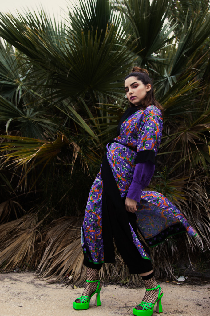 Φορώντας από μέσα ως βάση ένα μαύρο slouchy παντελόνι με στενές μανσέτες στον αστράγαλο, και ένα oversized μωβ πουκάμισο, έχουμε δώσει ένταση και όγκο για ένα σύγχρονο look, ενώ το σατέν κιμονό από πάνω είναι αυτό που ολοκληρώνει τα vibes του outfit και έρχεται σε αντίθεση με τα εσωτερικά ρούχα τα οποία έχουν σύνθεση από ύφασμα που στέκεται διαφορετικά.
