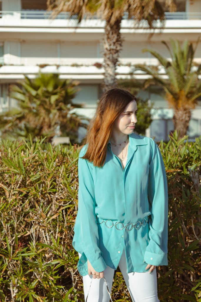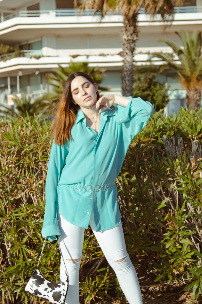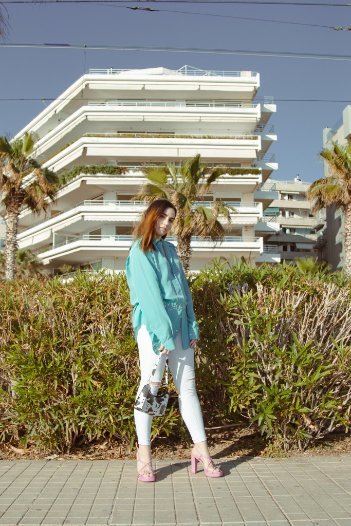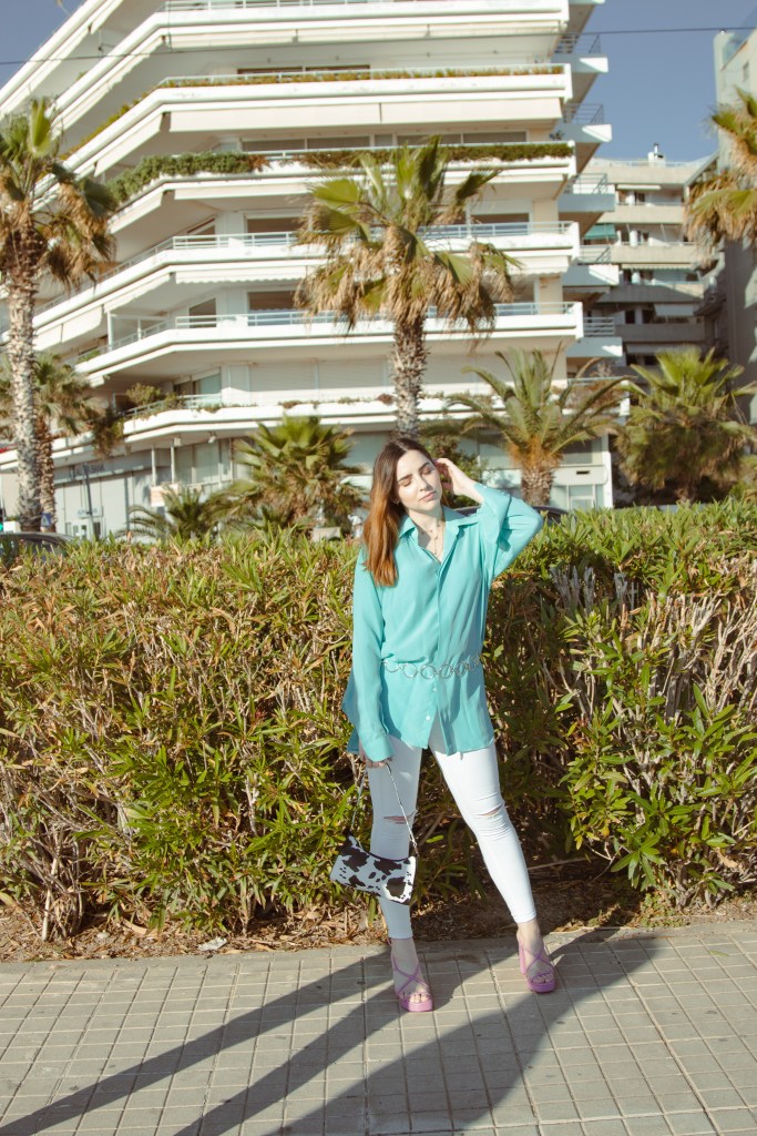 Αυτό το outfit post, έχει προκύψει από αυτή την αντίληψη μας, αφού συνδυάσαμε ένα λευκό skinny παντελόνι που λειτουργεί σα καμβάς, με ένα μεταξωτό πουκάμισο του μπαμπά στο super καλοκαιρινό τιρκουάζ χρώμα. Η ανάλαφρη σύνθεση και γραμμή του, προσαρμόζεται μέσα στη μεταλλική ζώνη που επιλέξαμε για να δώσουμε λάμψη και Y2K vibes, ενώ η τσάντα σε cow print έδωσε την ένταση που του χρειαζόταν.