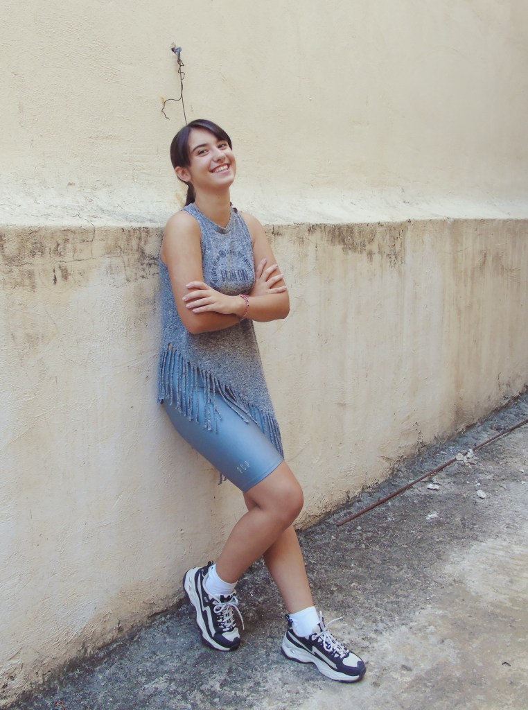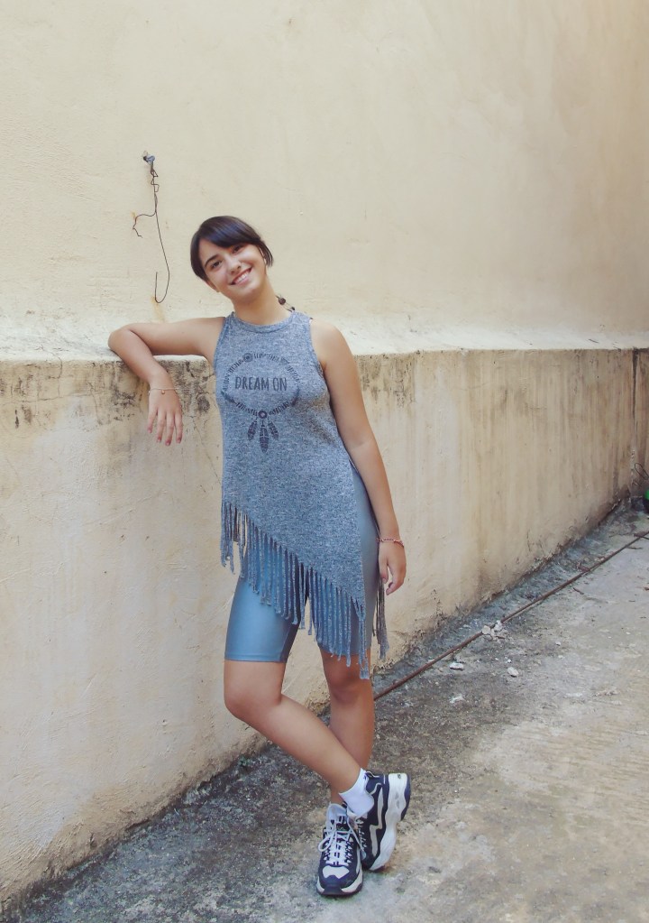 Ένα κομμάτι που δεν αποχωρίστηκε όλο το καλοκαίρι, αποτελούν τα ποδηλατικά κολάν και ειδικά αυτά της PCP με το glossy αποτέλεσμα που δίνει extra λάμψη. Το ταίριαξε με ένα αμάνικο top που τα ασύμμετρα κρόσσια δίνουν στυλ, ενώ τα chunky sneakers της δίνουν άνεση αλλά και attitude.