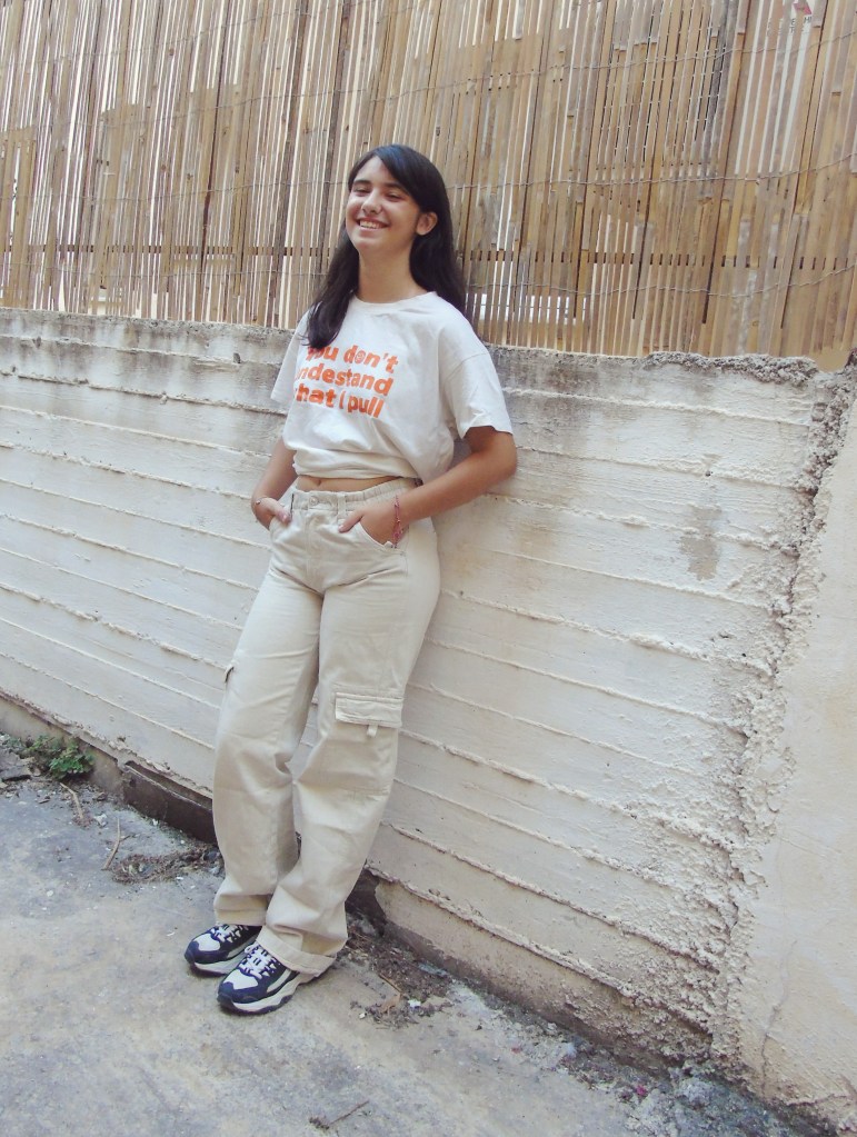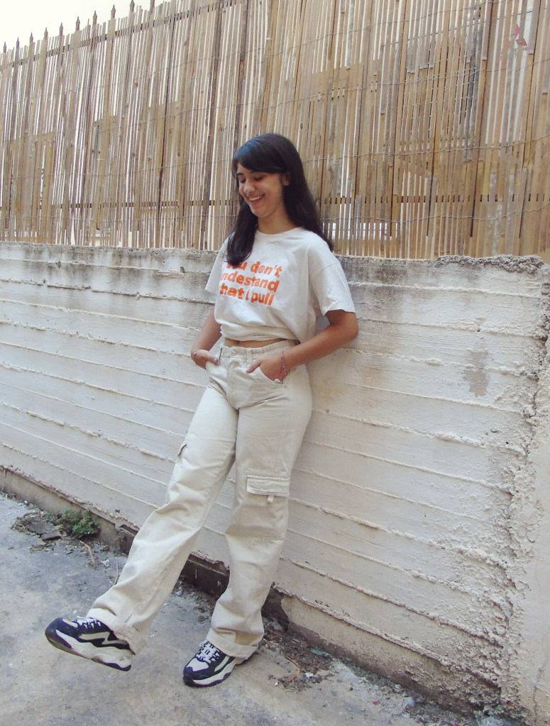 Τελευταίο, που θα φορεθεί σίγουρα και τα δροσερά πρωινά του Σεπτεμβρίου, είναι αυτό που έχει ως βάση το αγαπημένο της cargo παντελόνι, με ένα oversized top με quote από Greek Sayings & Quotes που την αντιπροσωπεύει και για το σχολείο και το διάβασμα της. Φόρεσε τα αγαπημένα της sneakers και το πιο μεγάλο χαμόγελο, και είναι έτοιμη για τη νέα σχολική χρονιά.