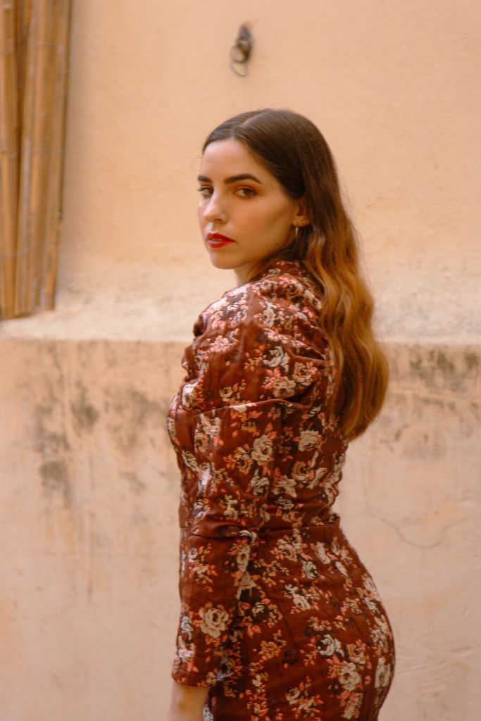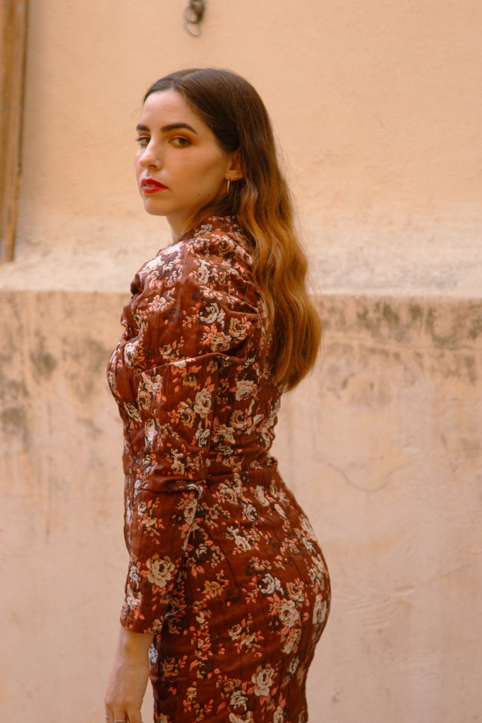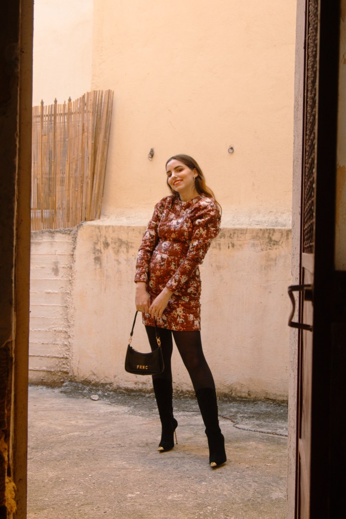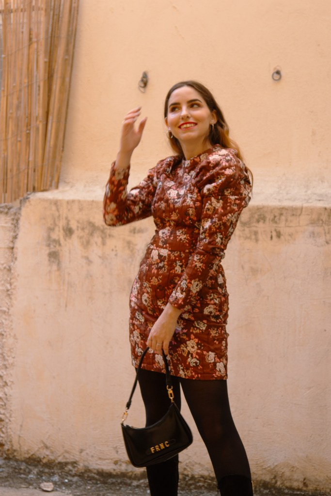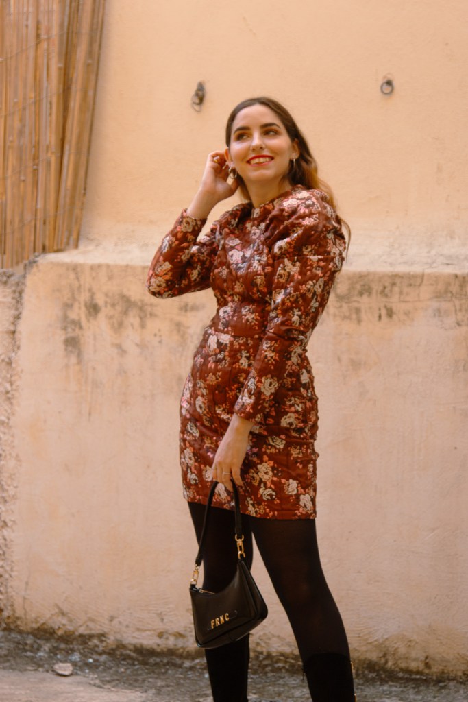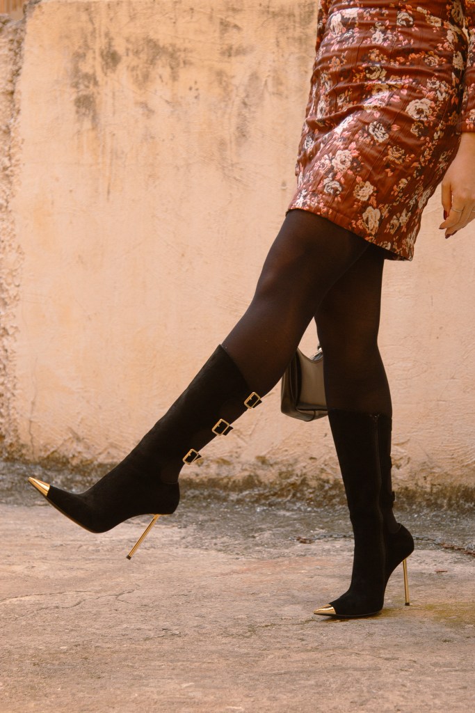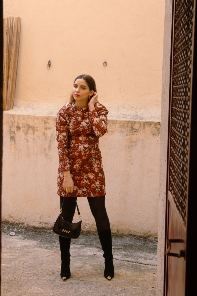 Όπως και σε αυτό το outfit post λοιπόν, επέλεξα ένα φόρεμα με floral print που θυμίζει ταπετσαρία, με φουσκωτά μανίκια και mock λαιμό, το οποίο αναδεικνύει τη σιλουέτα και δίνει ρομαντικά vibes στη στιγμή. Το συνδύασα με μπότες knee- high οι οποίες έχουν μεταλλικές λεπτομέρειες και αγκράφες για να δώσουν λάμψη, ενώ το τσαντάκι κινείται στην ίδια φιλοσοφία.