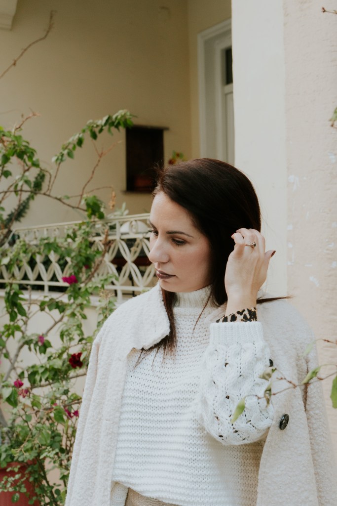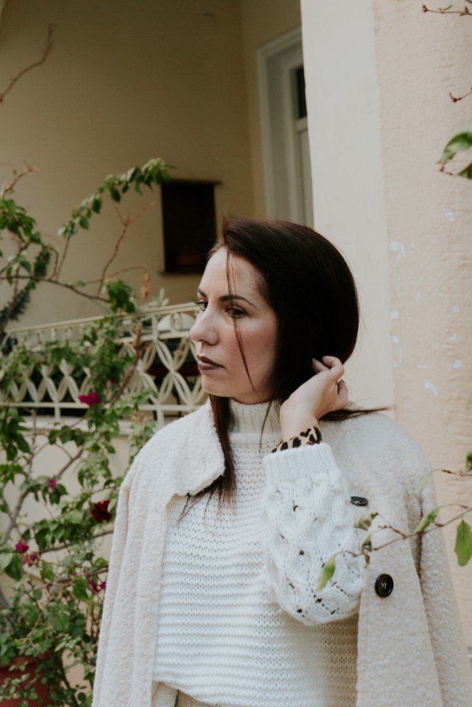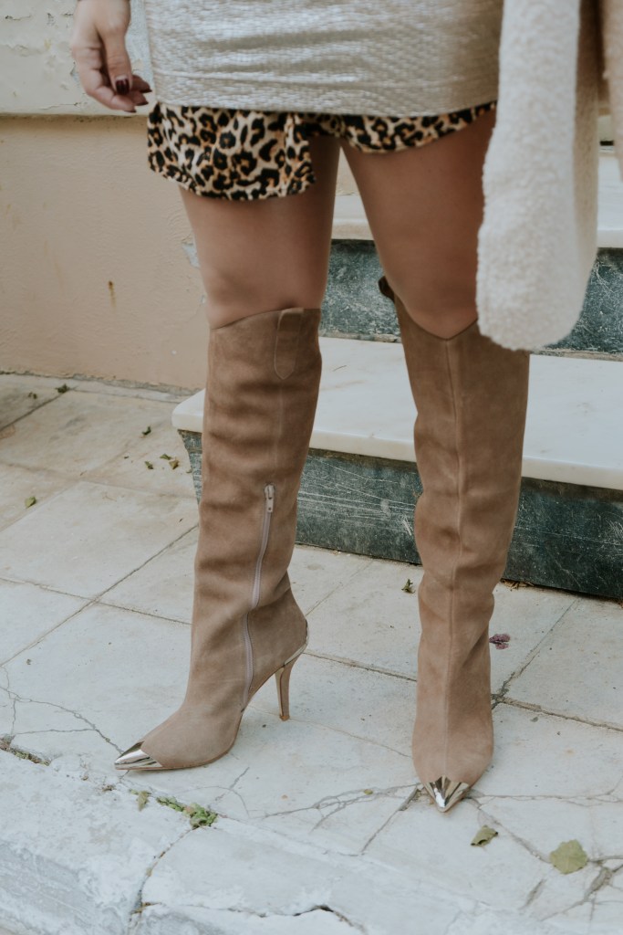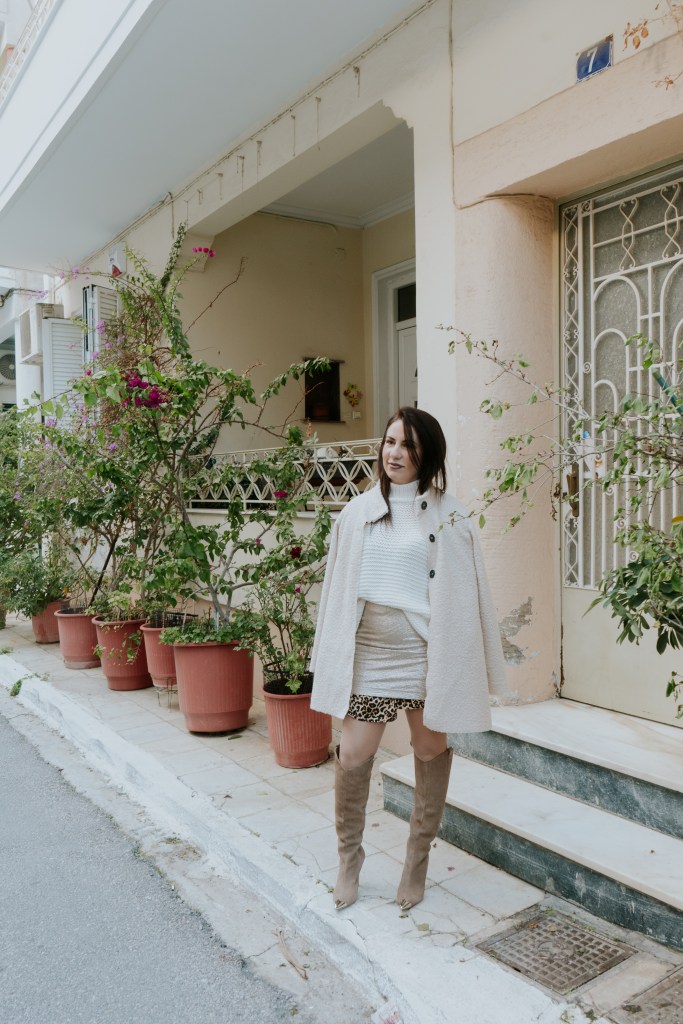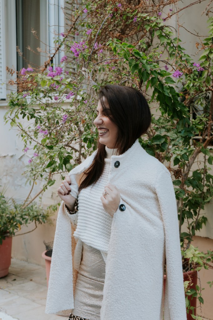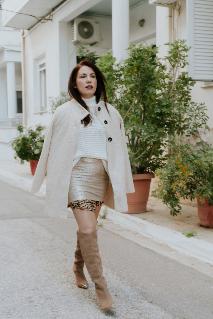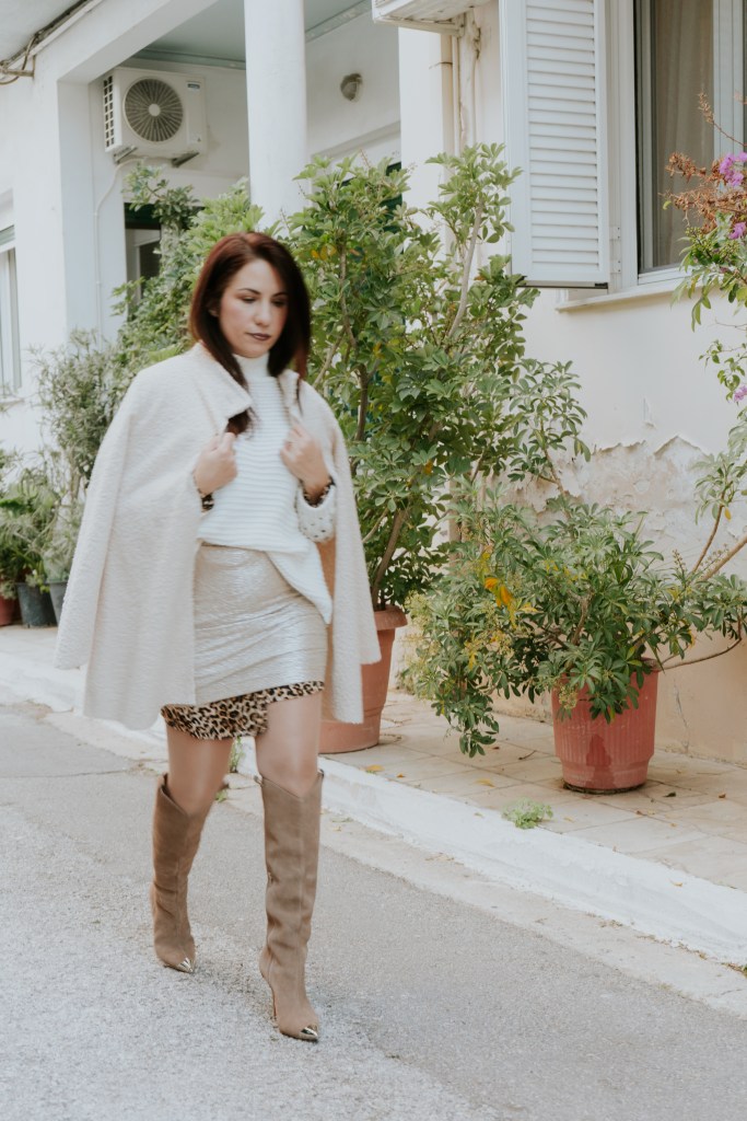 Η μεταλλική της υφή έρχεται κόντρα με την απλή της γραμμή και δίνει super λάμψη, για αυτό και προτίμησα να τη συνδυάσω με ένα λευκό πουλόβερ με ιδιαίτερη πλέξη ώστε να το ησυχάσει και να το κάνει λίγο πιο cozy. Το leopard φόρεμα από μέσα που φαίνεται ελάχιστα στα μανίκια και το τελείωμα της φούστας δίνει extra ενδιαφέρον και πληροφορία, ενώ το ελαφρύ πανωφόρι με teddy υφή και γιακά είναι super επιλογή για τις ηλιόλουστες μέρες που θέλεις κάτι ελαφρύ πάνω σου.