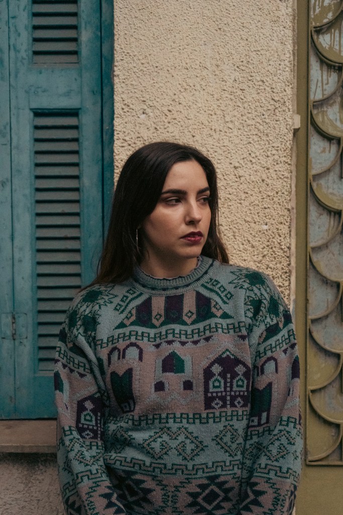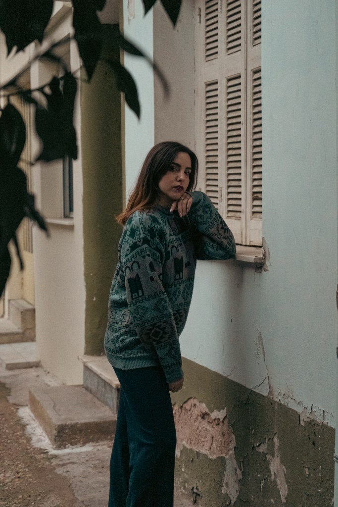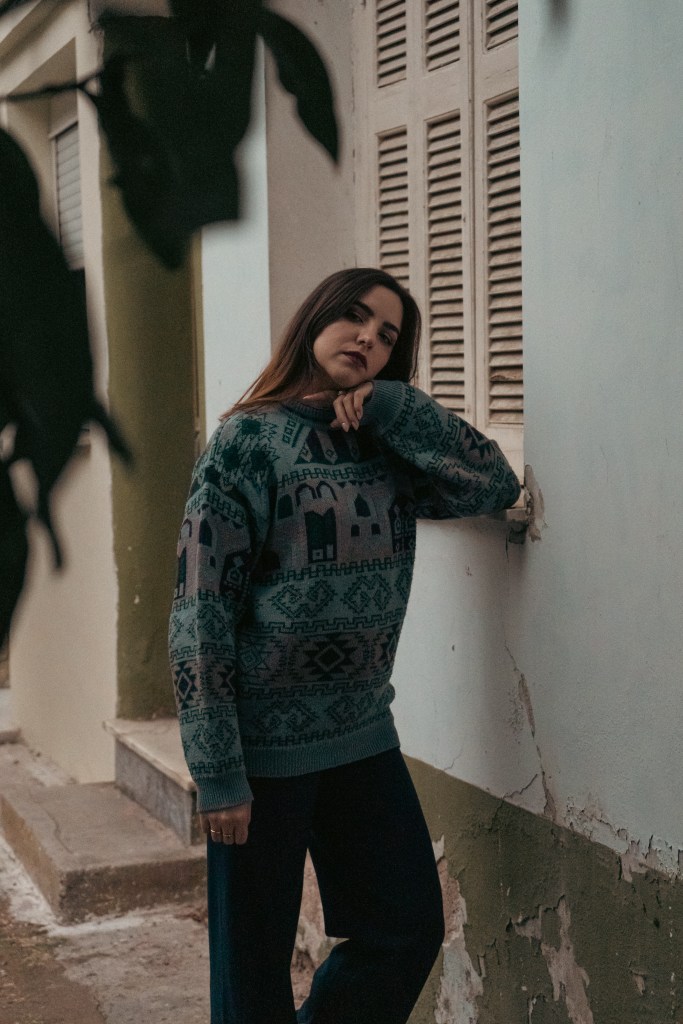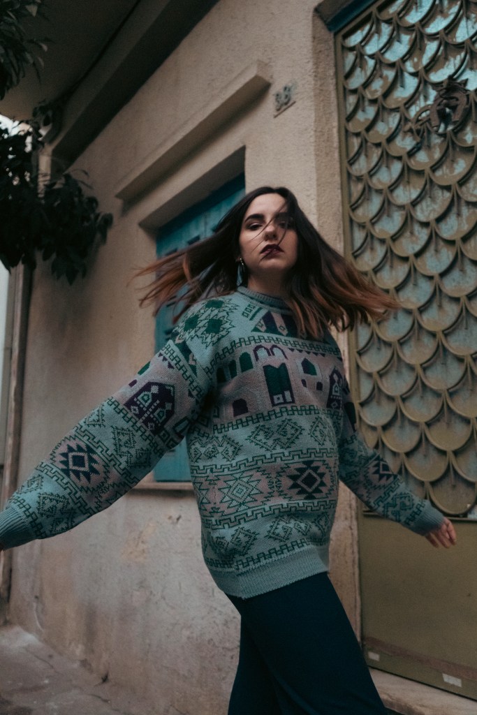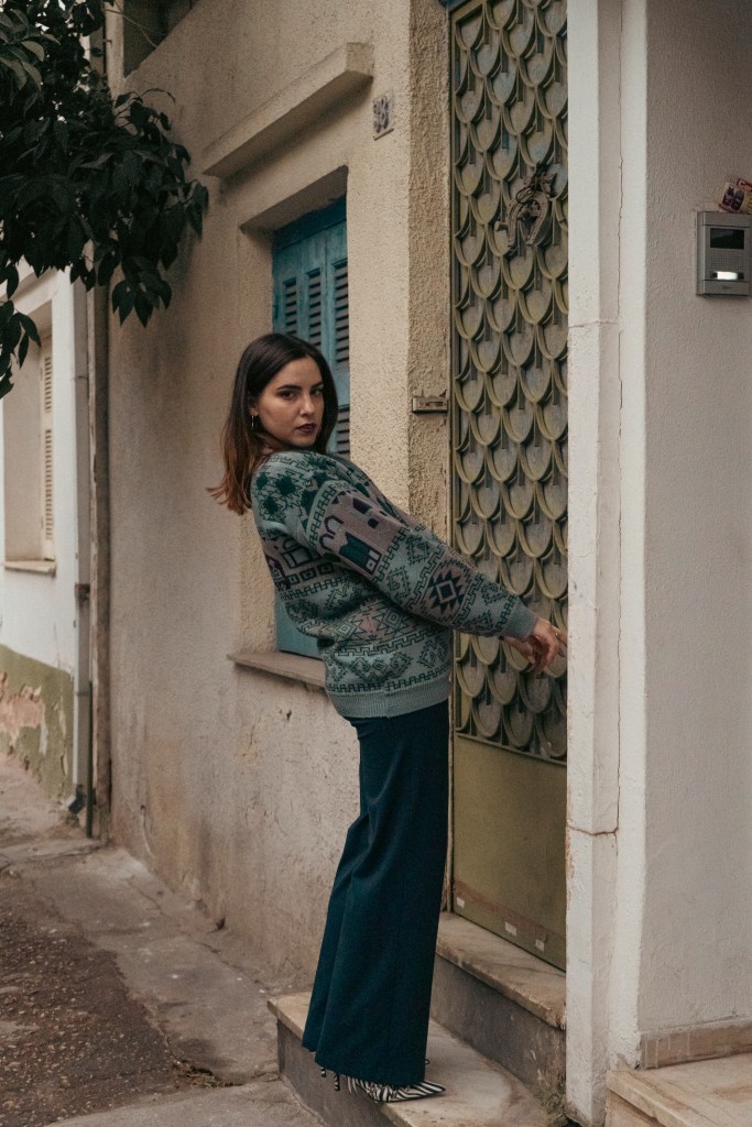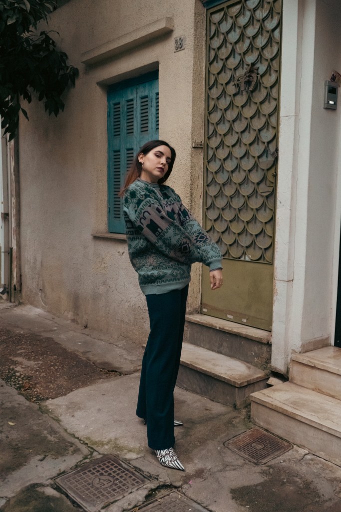 Για να δώσω ενδιαφέρον, το συνδύασα με ένα vintage oversized πουλόβερ του μπαμπά μου, το οποίο έχει ένα print που μου θυμίζει πάρα πολύ τον χειμώνα των 80s, που όλα ήταν τόσο απλά και πιο ξέγνοιαστα. Δίνει μια πιο loose φιγούρα στο σώμα μου αλλά μοιάζει με μια συνεχόμενη αγκαλιά, κάτι που το χρειάζομαι συχνά μέσα στη μέρα.