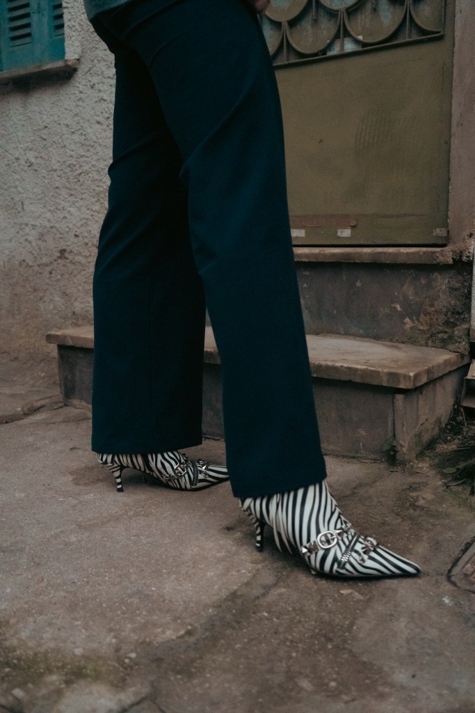 Για παπούτσια, επέλεξα ένα ζευγάρι kitten heels μποτάκια, σε super zebra print και μεταλλικά τρουκς και λεπτομέρειες, που δε γίνεται να μη τα προσέξεις. Είναι μυτερά μπροστά και ταιριάζουν ιδανικά με την ανάλαφρη γραμμή του παντελονιού, ενώ το χαμηλό τους τακούνι προσφέρει άνεση στο περπάτημα και τα κάνει κατάλληλα για κάθε ώρα της ημέρας.