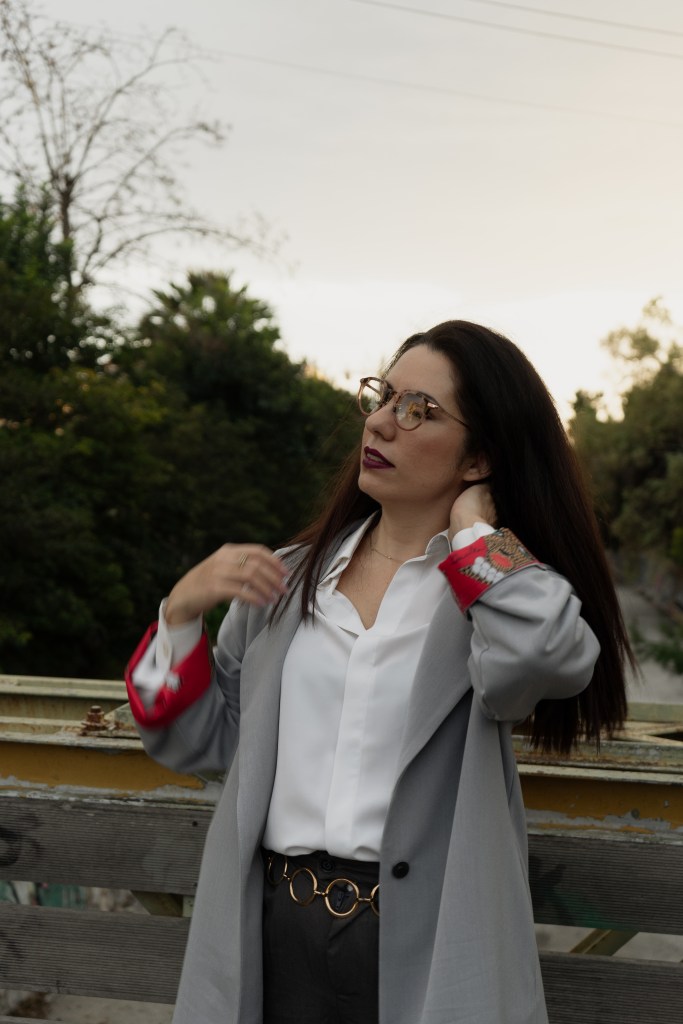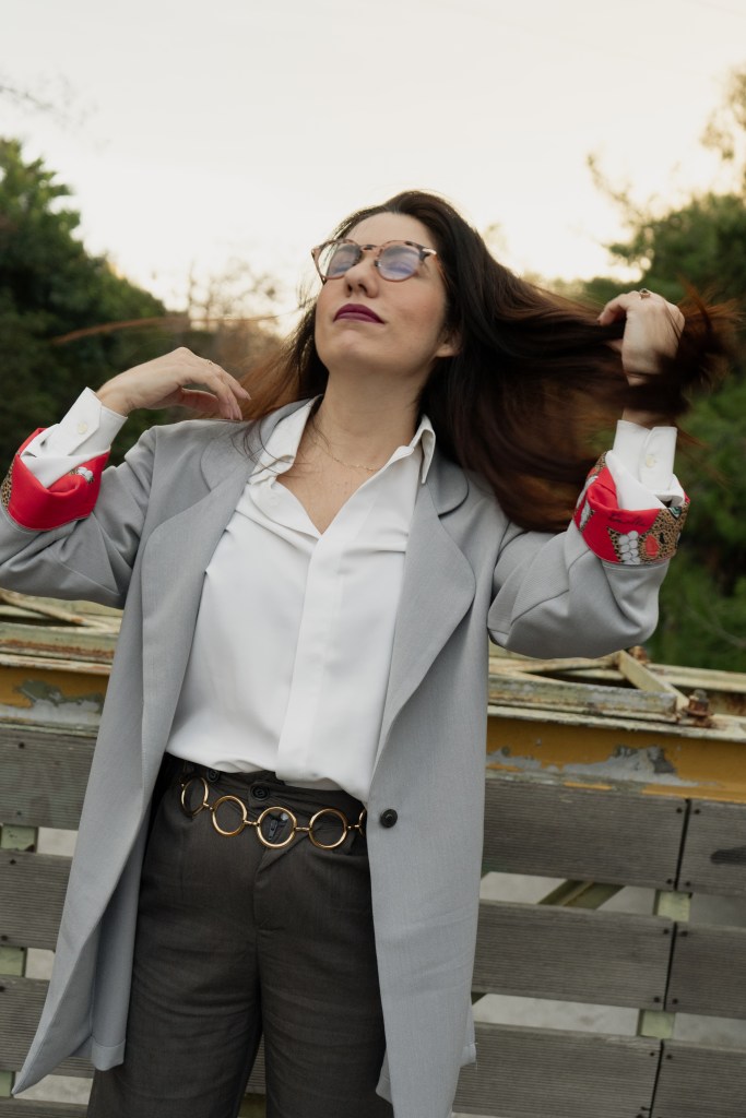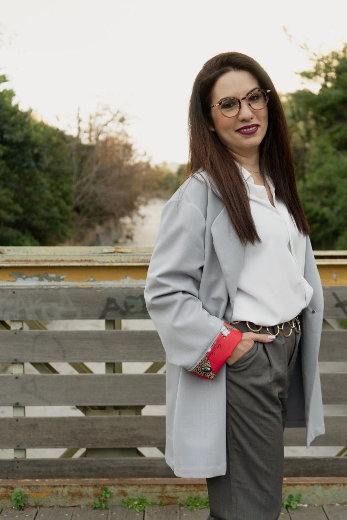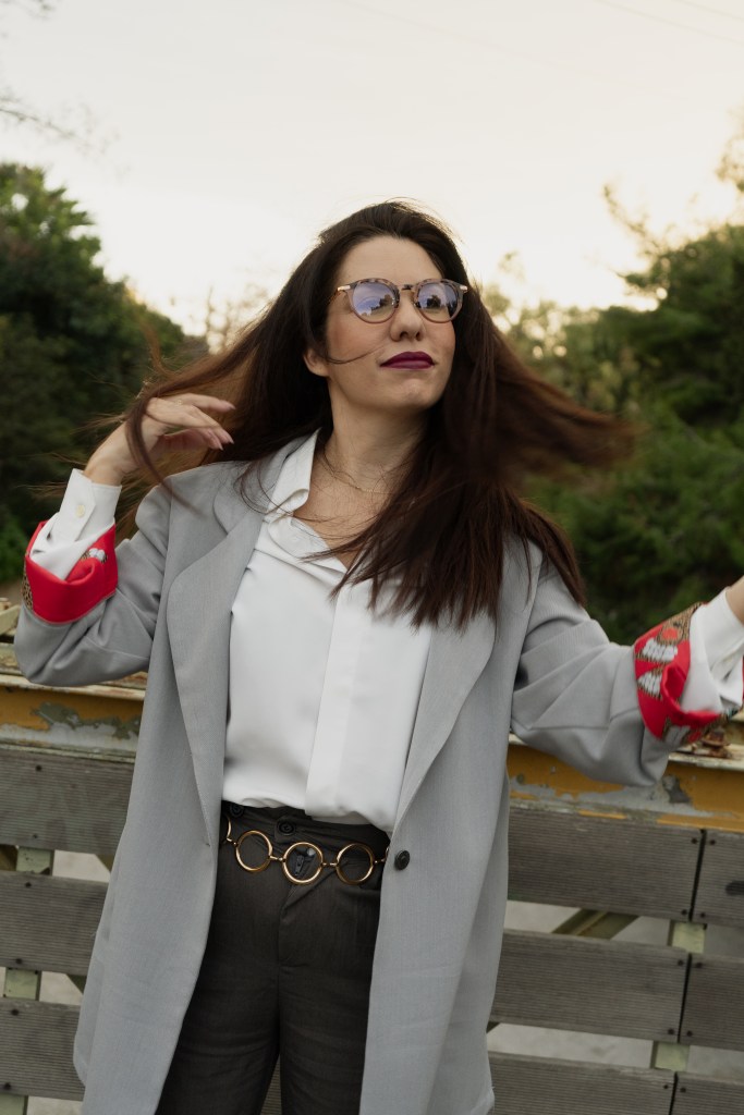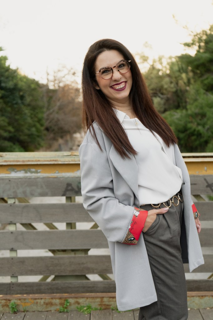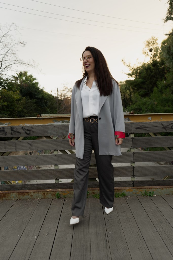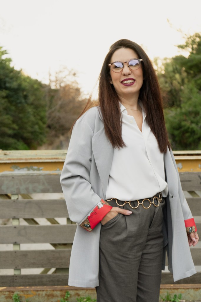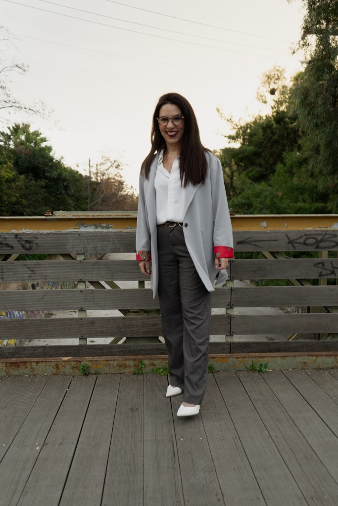 Έτσι λοιπόν αυτό το look, αποτελείται από ένα παντελόνι σε ίσια γραμμή με πιέτες σε σκούρο γκρι χρώμα, συνδυασμένο με ένα λευκό τύπου μεταξωτό πουκάμισο το οποίο είναι ανδρικό κι έτσι δημιουργεί oversized εφαρμογή. Από πάνω ως πανωφόρι, προσθέσαμε ένα oversized επίσης σακάκι, σε ανοιχτό γκρι με χρωματιστό ρεβέρ που δίνει χρώμα και ενδιαφέρον στο outfit, ενώ ένα ζευγάρι ψηλοτάκουνες γόβες ήταν must have για να δώσει extra στυλ και κομψότητα στη σιλουέτα.