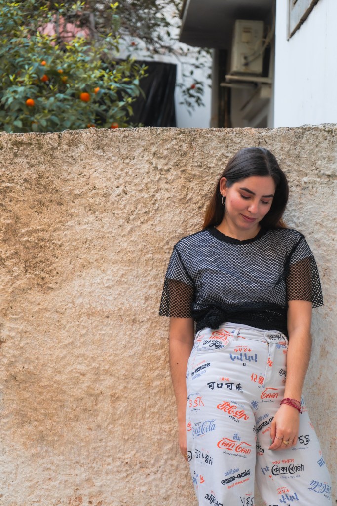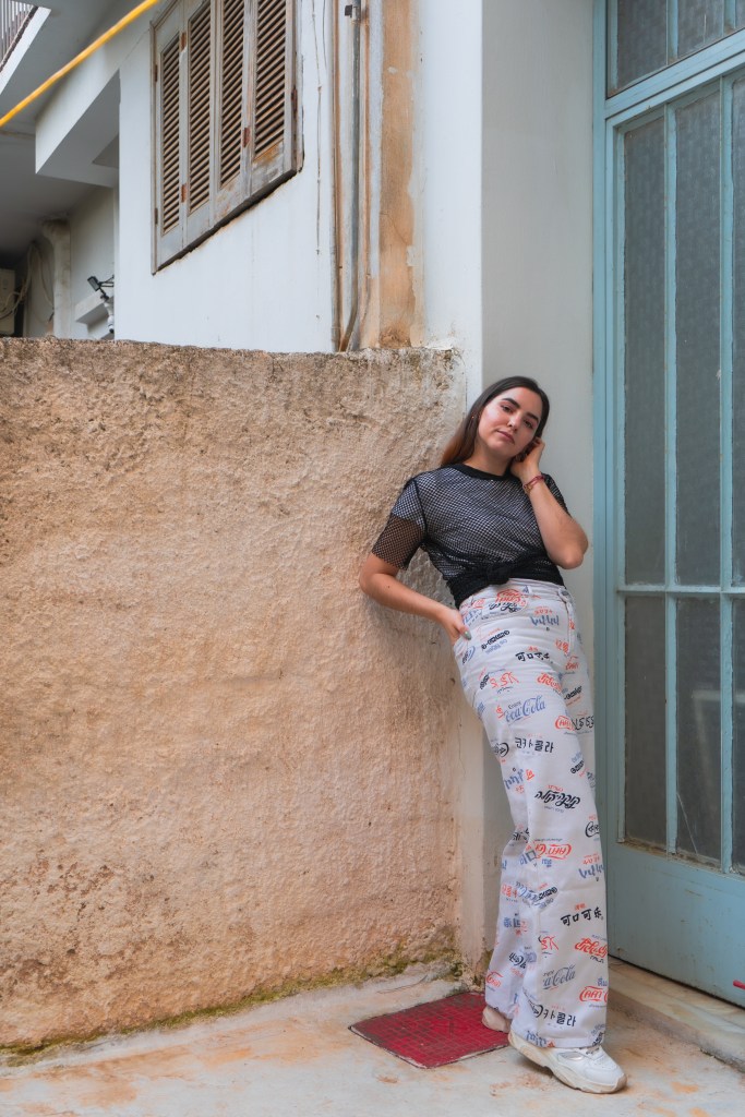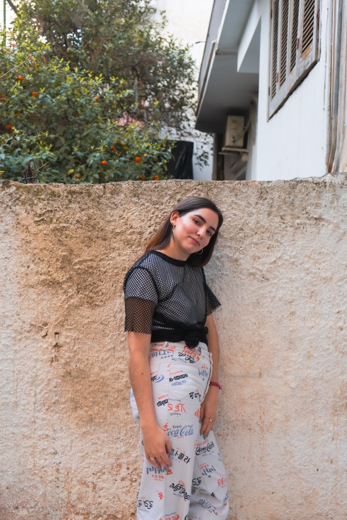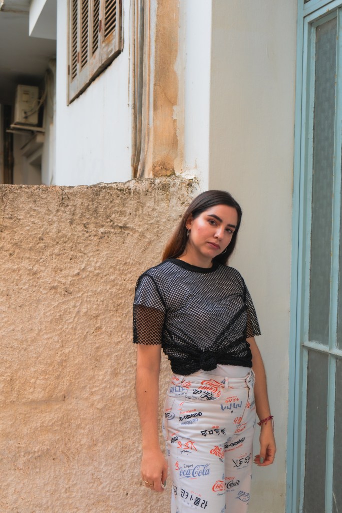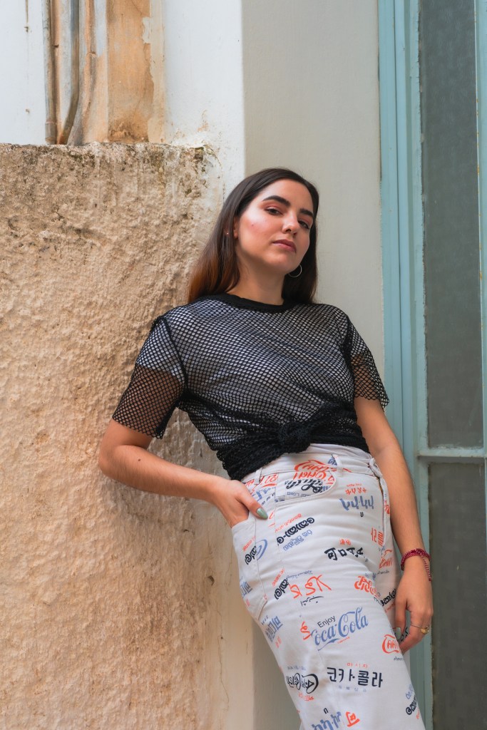 Για να δώσουμε extra ενδιαφέρον, προσθέσαμε από πάνω ένα διχτυωτό T- shirt το οποίο δέσαμε σε κόμπο μπροστά, ενώ για παπούτσια δε γινόταν να επιλέξουμε κάτι άλλο από ένα ζευγάρι λευκά sneakers από την αγαπημένη μας FAVELA.