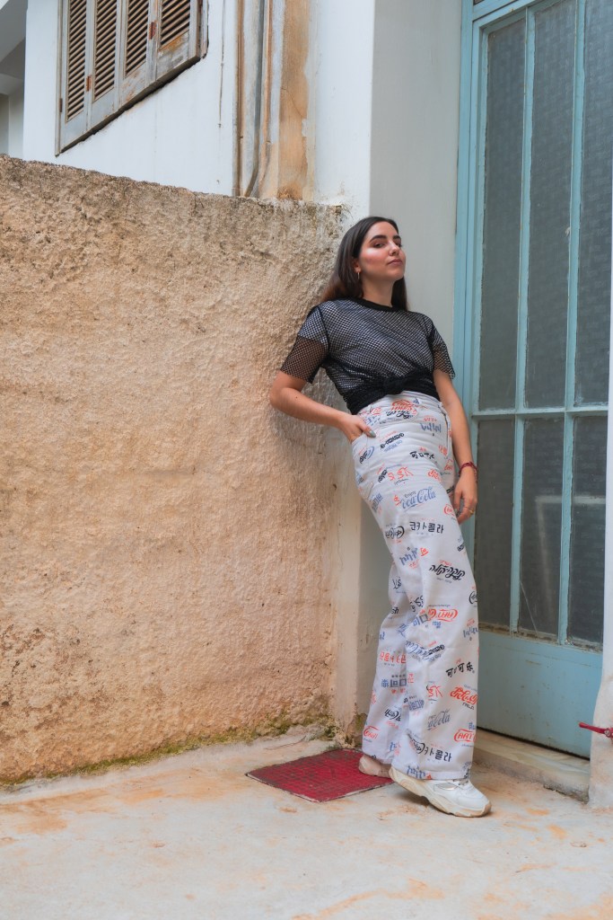 Αποτελείται από ένα iconic παντελόνι που κάναμε δικό μας, ψηλόμεσο με φαρδιά μπατζάκια και ανελαστική τζιν σύνθεση, το οποίο κλέβει την παράσταση στη στιγμή με τα λογότυπα που έχει πάνω και το συνδυάσαμε αρχικά με ένα basic λευκό T-shirt.