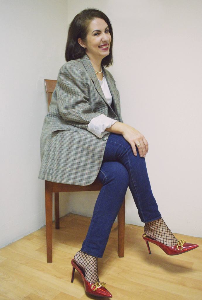 3.Last but not least, η Mama Stalker φόρεσε το σακάκι με ένα πιο κομψό τρόπο, φορώντας ένα μπλε τζιν παντελόνι σε πιο ίσια γραμμή και ένα λευκό κοντομάνικο T- shirt, ενώ τα παπούτσια κάνουν τη διαφορά αφού είναι κατακόκκινα μυτερά mules. Για extra στυλ, φόρεσε διχτυωτά καλτσάκια και κόκκινο κραγιόν.