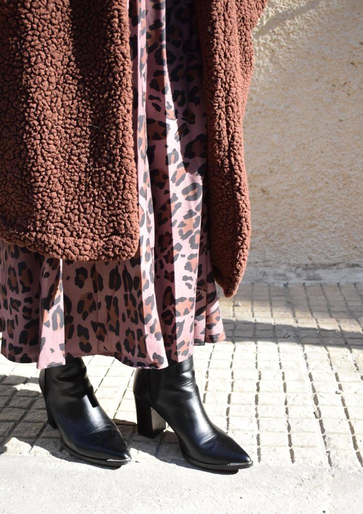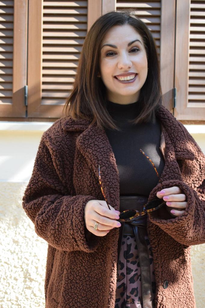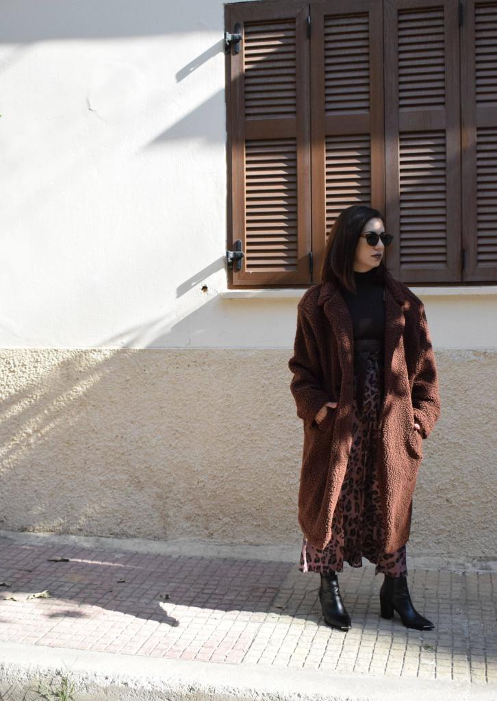 Για να φορέσουμε το look κάθε στιγμή της ημέρας ακόμα και τις πιο κρύες ώρες, το ολοκληρώσαμε ένα μακρύ πανωφόρι με sherpa σύνθεση στην ίδια χρωματική παλέτα, αλλά και ένα ζευγάρι ψηλοτάκουνα μποτάκια που είναι κατάλληλα και για περπάτημα λόγω του μέτριου ύψους τους.