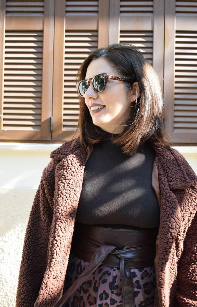 Οι λεπτομέρειες έκαναν τη διαφορά και σε αυτό το look κι έτσι προσθέσαμε μια δερμάτινη ζώνη στη μέση για να δέσουν ομοιόμορφα όλες οι αποχρώσεις αλλά και ένα ζευγάρι στρογγυλά γυαλιά ηλίου με tartarooga print, ενώ και το μακιγιάζ ακολούθησε αυτούς τους τόνους για ένα total brown outfit.